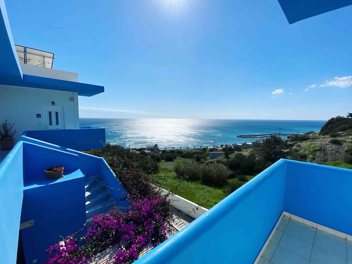 Nuestros apartamentos están situados en el corazón del pueblo de Kastri. Desde el balcón se tiene una vista increíble sobre el mar de Libia. Las playas naturales, las tabernas con su comida tradicional cretense, las cafeterías y los 2 minimercados están a pocos minutos a pie. Si quieres vivir el estilo de vida cretense más allá del turismo de masas, ¡aquí estás en el lugar correcto!