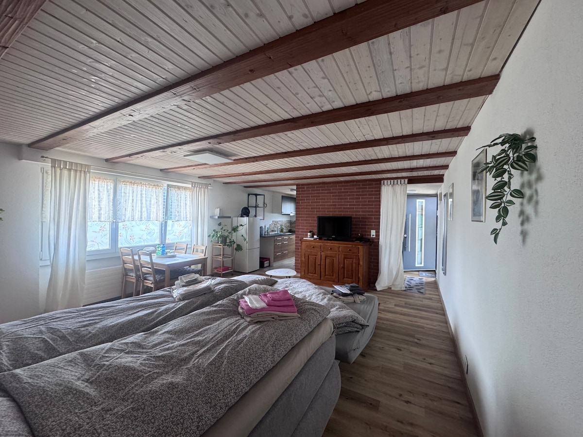Acogedor apartamento en el ático con entrada independiente y escalera, con baño limpio, cocina pequeña y un balcón con vistas al lago de Constanza y los Alpes suizos. Disfrute de su té de la mañana o café en el balcón y se siente como si estuviera en un retiro. Uso gratuito de la cocina comunitaria con equipo completo. Estacionamiento privado frente a la casa, también espacio para caravanas y caravanas. Alquilamos la habitación de forma semanal.