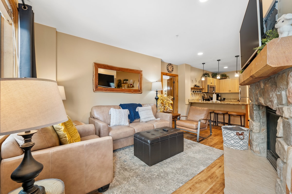 Departamento en Keystone recientemente renovado con techos abovedados, decoración moderna de montaña y una chimenea a leña. Disfrutá de una cocina totalmente equipada, una sala de estar de lujo y un dormitorio tranquilo, todo a solo unos minutos de los ascensores, los senderos y los restaurantes del pueblo. Los trabajadores remotos van a apreciar el wifi rápido para trabajar y relajarse. Con servicios como una pileta cubierta, jacuzzi, sauna seca y un armario privado para esquíes, este es el lugar ideal para parejas y familias jóvenes. Permiso para estadías BCA-99823
