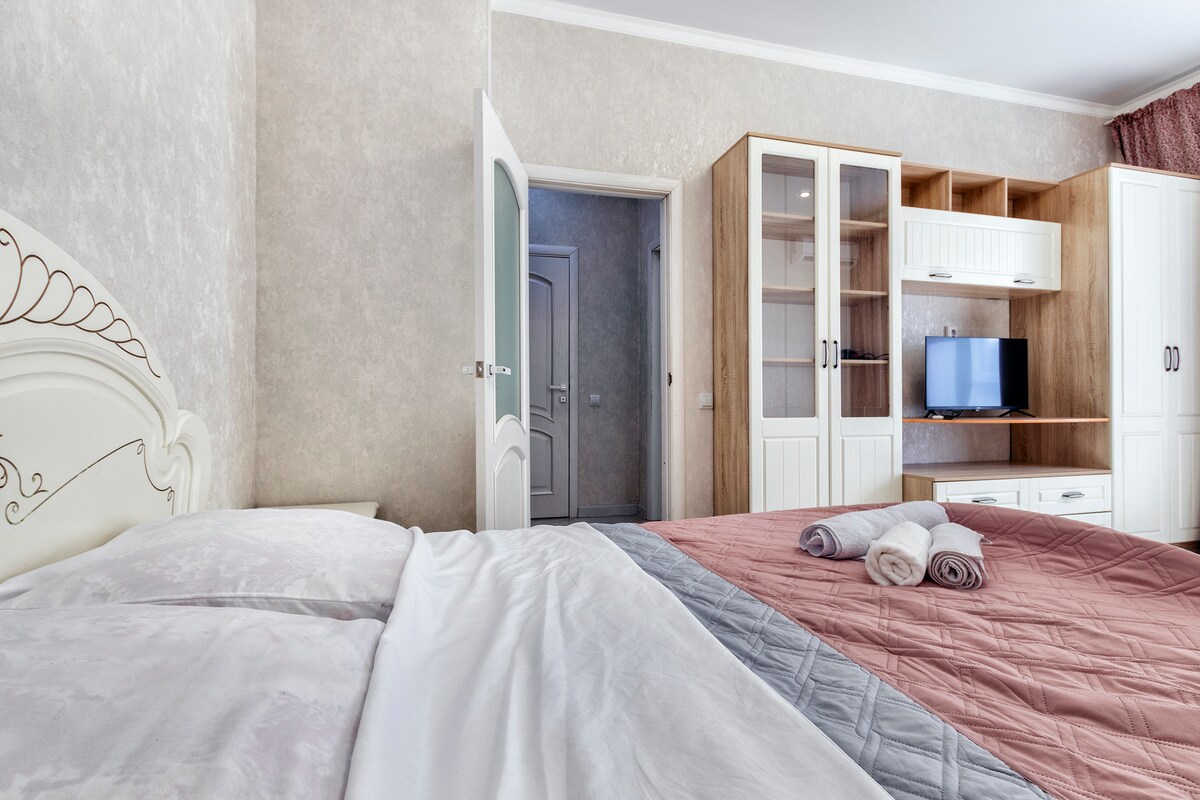 Estimados huéspedes, encontrarán un acogedor apartamento de un dormitorio con una renovación moderna y de alta calidad en colores tranquilos. En nuestro apartamento puedes relajarte después de una larga jornada y relajarte. El dormitorio tiene una cómoda cama con colchón ortopédico para ti, la cocina cuenta con todos los electrodomésticos y utensilios necesarios para cocinar. El baño dispone de amplia ducha.