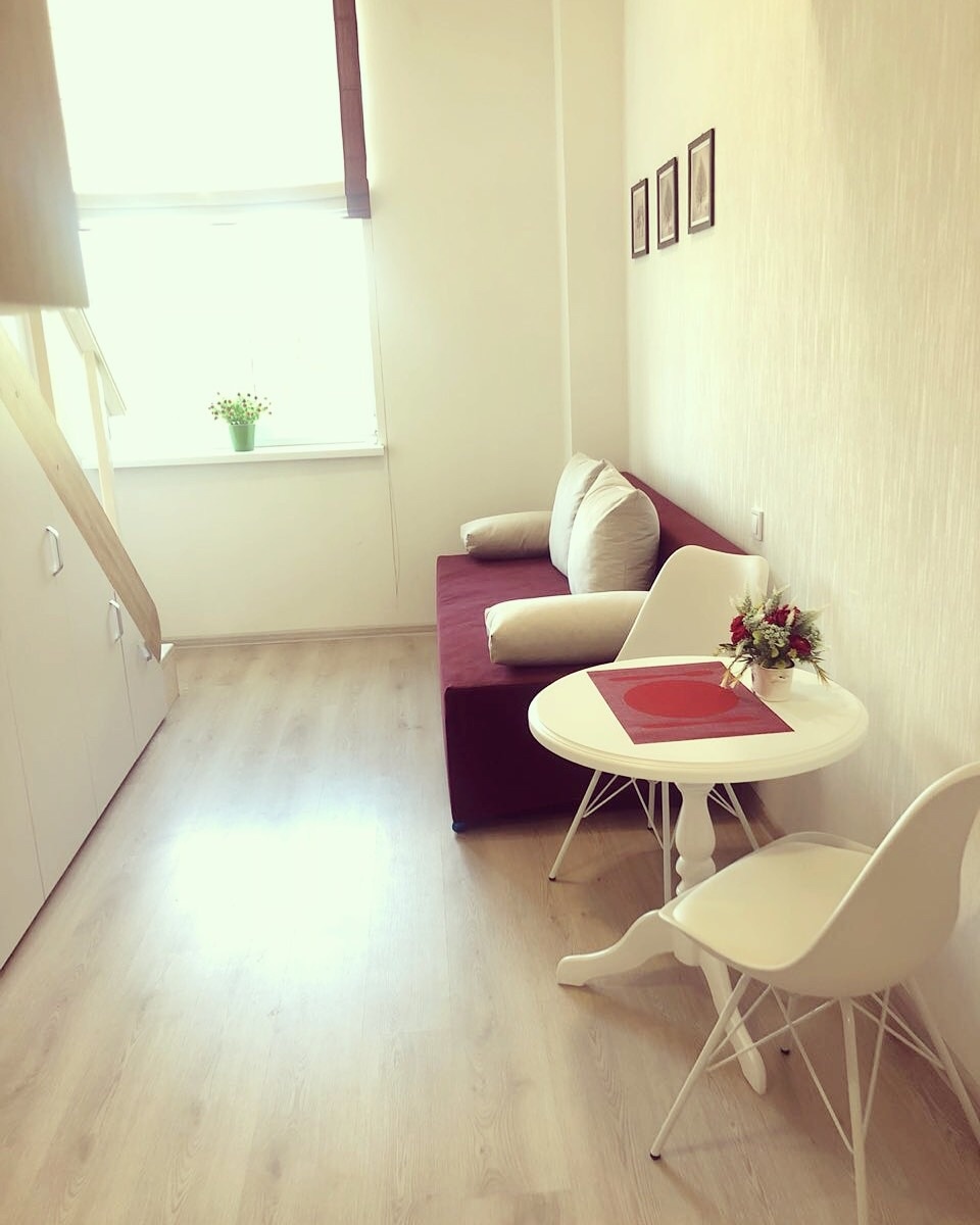 Uno de los estudios en los apartamentos de tipo hotelero (13 apartamentos en la misma planta) con 2 dormitorios separados a 4 minutos de m. Konstitutsii y a 3 minutos del club Panorama. Diseño sobrio, solo el equipamiento más necesario para el descanso y la relajación, incluyendo TV inteligente y electrodomésticos de cocina.