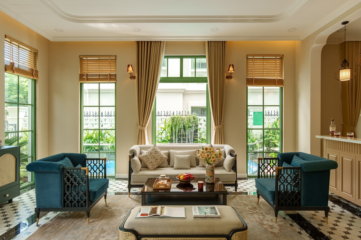 La villa se encuentra en el lujoso centro vacacional Bãi Khem🏖️, con 4 amplios dormitorios y comodidades modernas en estilo tropical moderno. El diseño minimalista y refinado utiliza materiales naturales como la madera y la piedra, lo que crea un ambiente tranquilo. La piscina comunitaria cubierta ofrece un espacio relajante y sociable. 🏊♂️ A solo 500 metros de la playa, ofrece un fácil acceso a la playa de arena blanca y aguas cristalinas🌊, combinando las comodidades modernas con un estilo de vida tranquilo.