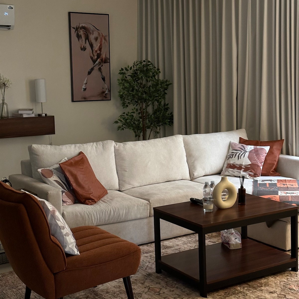 يتميز مكان الإقامة بتصميمه العصري الدافئ الذي يجمع بين البساطة والفخامة في آن واحد تطل النوافذ الكبيرة على منظر هادئ يضيف لمسة طبيعية منعشة، بينما توفر الستائر السميكة خصوصية تامة عند الحاجة. الغرف مزودة بجميع وسائل الراحة الأساسية، ومنطقة الجلوس أنيقة مثالية للقراءة أو الاسترخاء أما الحمام، فهو مصمم بأسلوب راقٍ، مزود بتجهيزات ولمسات فندقية تضمن تجربة مريحة. تتميز المساحة بنظافتها الفائقة وتنظيمها العملي، مما يجعل الإقامة تجربة هادئة تمنح الضيوف شعورًا بالاستجمام والرفاهي