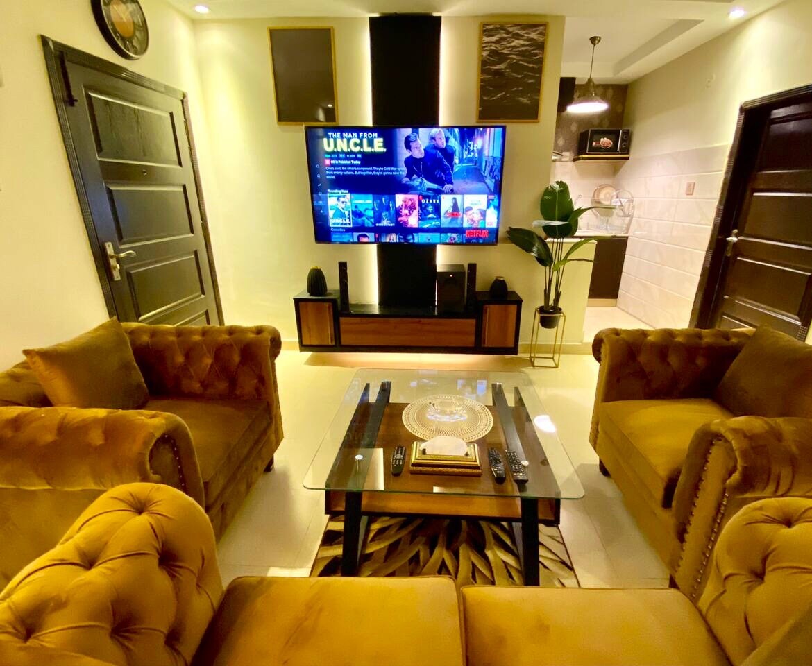 Entra en los apartamentos de 3 dormitorios de Flamingo Grand, los apartamentos con servicio más sofisticados y estéticamente emocionantes de Islamabad. Disfrute de una experiencia segura y con estilo en este lugar céntrico. Tanto si visitas Islamabad por placer como por trabajo, en Flamingo te aseguramos una experiencia de 5 estrellas. Los huéspedes también disfrutan de una plaza de aparcamiento gratuita y segura, wifi gratuito y la experiencia de ver sus series de televisión favoritas en el led inteligente de 65 pulgadas.