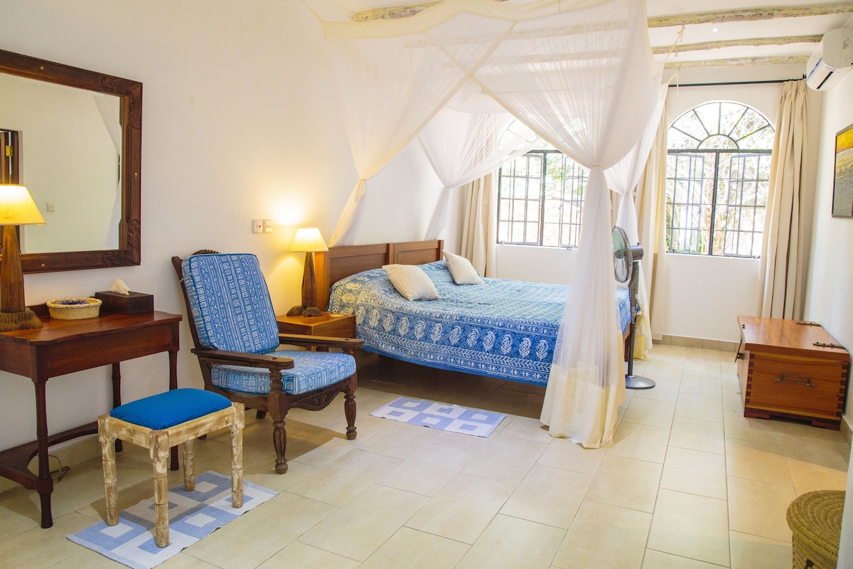Impresionante estudio espacioso y ecológico, situado en terrenos de propiedad privada. Entre la casa principal de los anfitriones y el apartamento de nueva construcción. Experimentarás privacidad, lejos de las carreteras principales o centros vacacionales: lujo y paz asequibles. Modernizado y en una ubicación perfecta de tranquilidad, a pocos pasos de una playa privada con acceso a la inspiradora costa de Watamu, te encontrarás con un impresionante banco de arena. Esnórquel, buceo y deportes acuáticos disponibles. Mida Creek está cerca, ¡un lugar de primera para tomar una copa!
