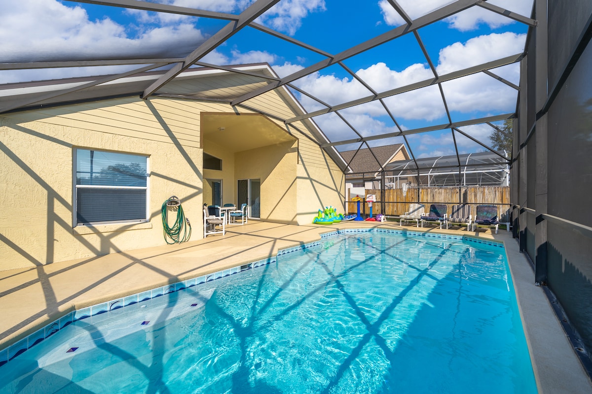 Sit back and relax in this stylish home with all the amenities you need for a fun family getaway. This home has a spacious layout with 3 bedrooms and 2 baths. We have thought of everything so you don't have to-toiletries,washer/dryer, and wifi. Enjoy your morning coffee in the screened in pool area with a beautiful sunrise and lake view or sip a glass of wine while floating in the pool. Just minutes to Theme Parks and major highways, this is the dream home you have been waiting for!