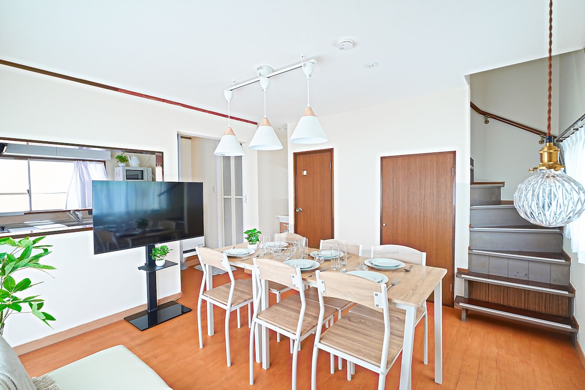 Acerca de 🏠SAKAE HOUSE Casa independiente en el tercer piso, dormitorio 3, recién remodelado, entero Primer piso: sala de estar, sofá cama para 3 personas, mesa para 8 personas, mesa baja, TV (películas gratis, programas de TV), Wi-Fi de alta velocidad, cocina, heladera, microondas, horno tostador, agua caliente, utensilios de cocina, condimentos  Ducha X2 Suministros de ducha Secadora de pelo X2 Lavadora detergente para ropa Aspiradora  Sin cepillo de dientes Segundo piso: 2 habitaciones de tatami de estilo japonés de 13,02 metros cuadrados y un futón de 8,51 metros cuadrados, conjunto de 7 espacios de almacenamiento, cortina opaca con inodoro, lavabo. 3.º piso: habitación de estilo occidental con 2 camas dobles de 160 cm × 200 cm, espacio de almacenamiento, cortinas opacas, inodoro (con alcohol desinfectante en el asiento), balcón, tendedero. Elegimos cuidadosamente cada mueble, ropa de cama, etc. para que nosotros mismos los usemos, de modo que podamos proporcionar una casa de vacaciones relajante y cómoda para amigos y familiares. Esperamos conocer a amigos de todo el mundo y que tanto niños como adultos disfruten de un viaje divertido donde puedan caerse, jugar y reír mientras se curan con el aroma del césped natural en las alfombras de tatami.