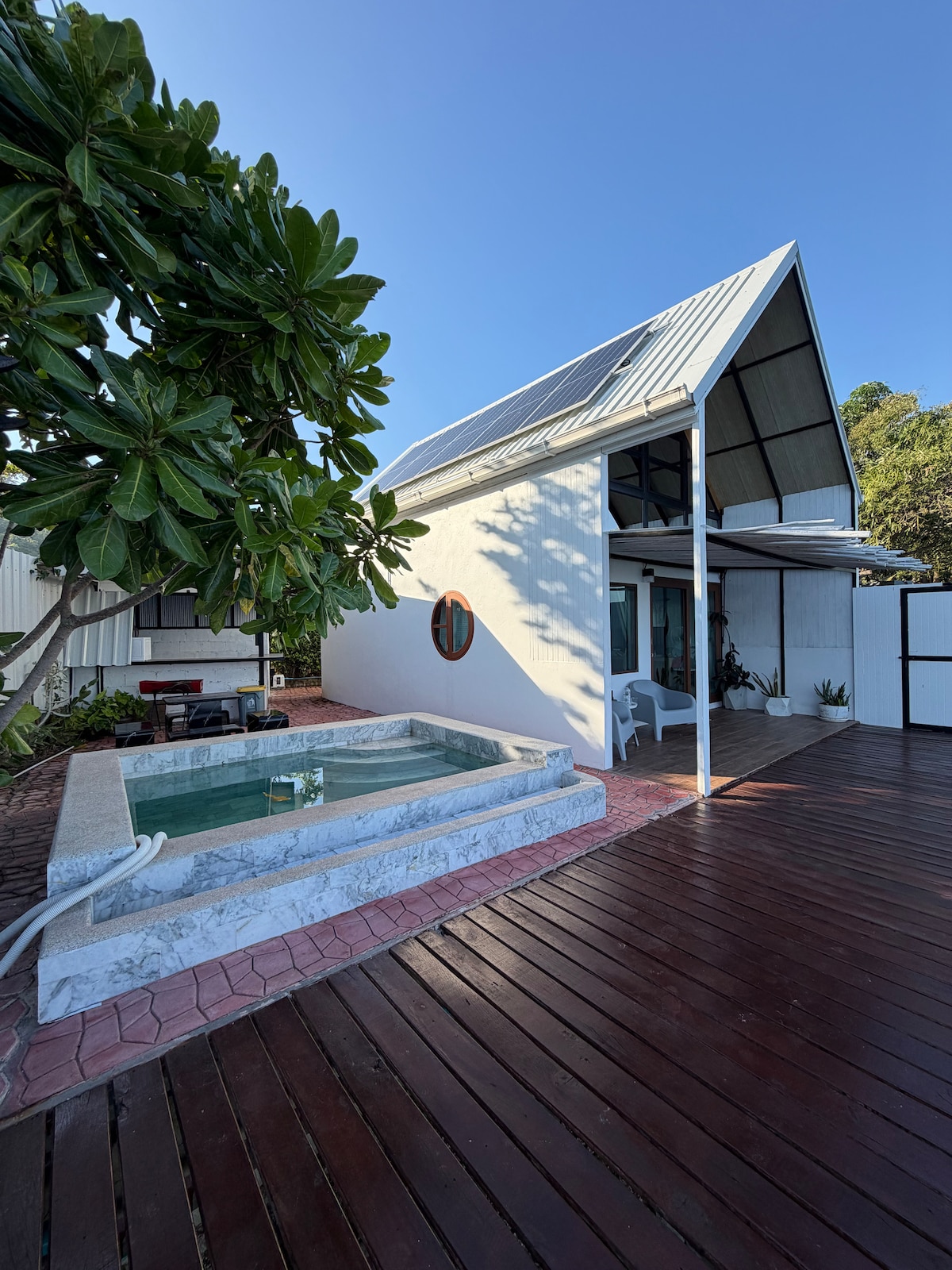 Villa Airy con piscina de 2 dormitorios en la tranquila zona de Sairee Beach con traslado GRATUITO al muelle. ¡Camina hasta la playa! A solo 10 minutos a pie de la playa, restaurantes, tiendas y bares, esta villa está ubicada en un pequeño carril con techo abovedado, sofá de esquina, baño completo y cocina abierta. El internet WiFi más rápido y confiable disponible en Koh Tao. Diseñado para 5 adultos con una capacidad máxima de 7. ¡Contáctanos para grupos más grandes y disidencias para niños! Tiene un techo de tejas real - sólo el interior es paja.