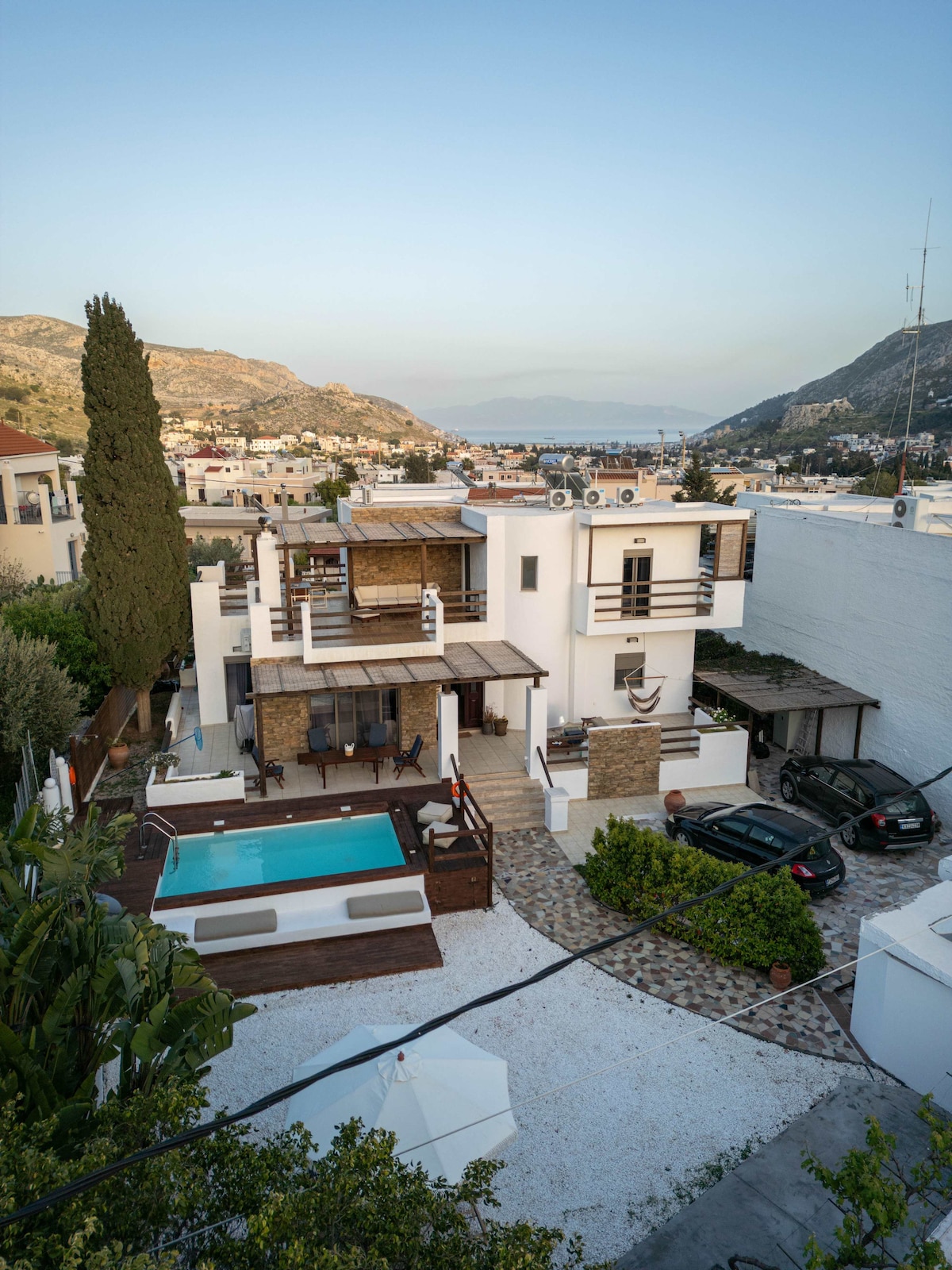Surrounded by magical tropical gardens with panoramic views of the Aegean Sea. Each sea-facing sundrenched villa has a private pool and terrace. Our outdoor "plateia" has a children's playground, a fully equipped outdoor gym, a snack bar, and an open-air cinema. So kick back, relax, and immerse yourself in this serene and stylish space. Tesla Model Y rental is included in the price, purchase of insurance is mandatory. Breakfast is included in the price New for Summer 2026: On site Padel Court