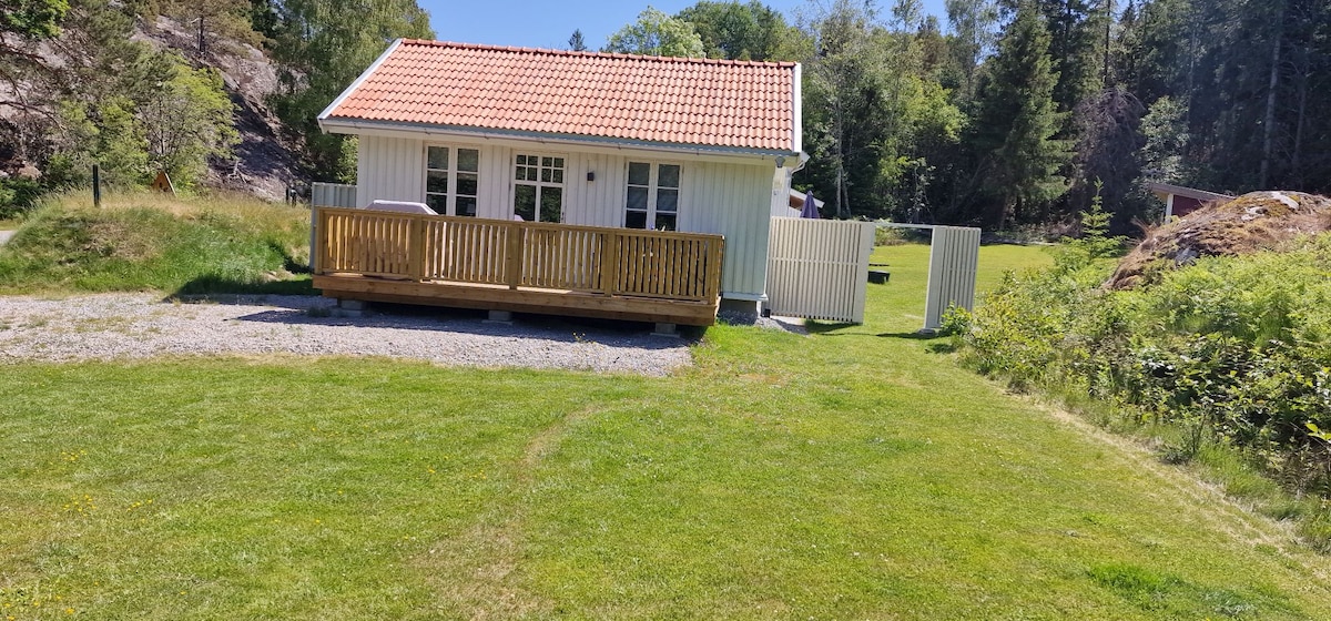 Kök och allrum med 155 cm dagsäng och havsutsikt. Stort sovrum med 160 cm dubbelsäng. Kök med ugn/induksjonshäll, kyl/frys, disk och micro. Bad med dusch, tvättmaskin och torktumlare. Altan och stor uteplats med gräs. Parkering utanför. 10 minuters gånge til vattnet med stränder, klippor och båthamn, skogen 1 minut bakom huset. 15 min att köra til centrum, 10 minuter til Nordby shopping. 20 minuter till Koster med båt. Lugnt område.