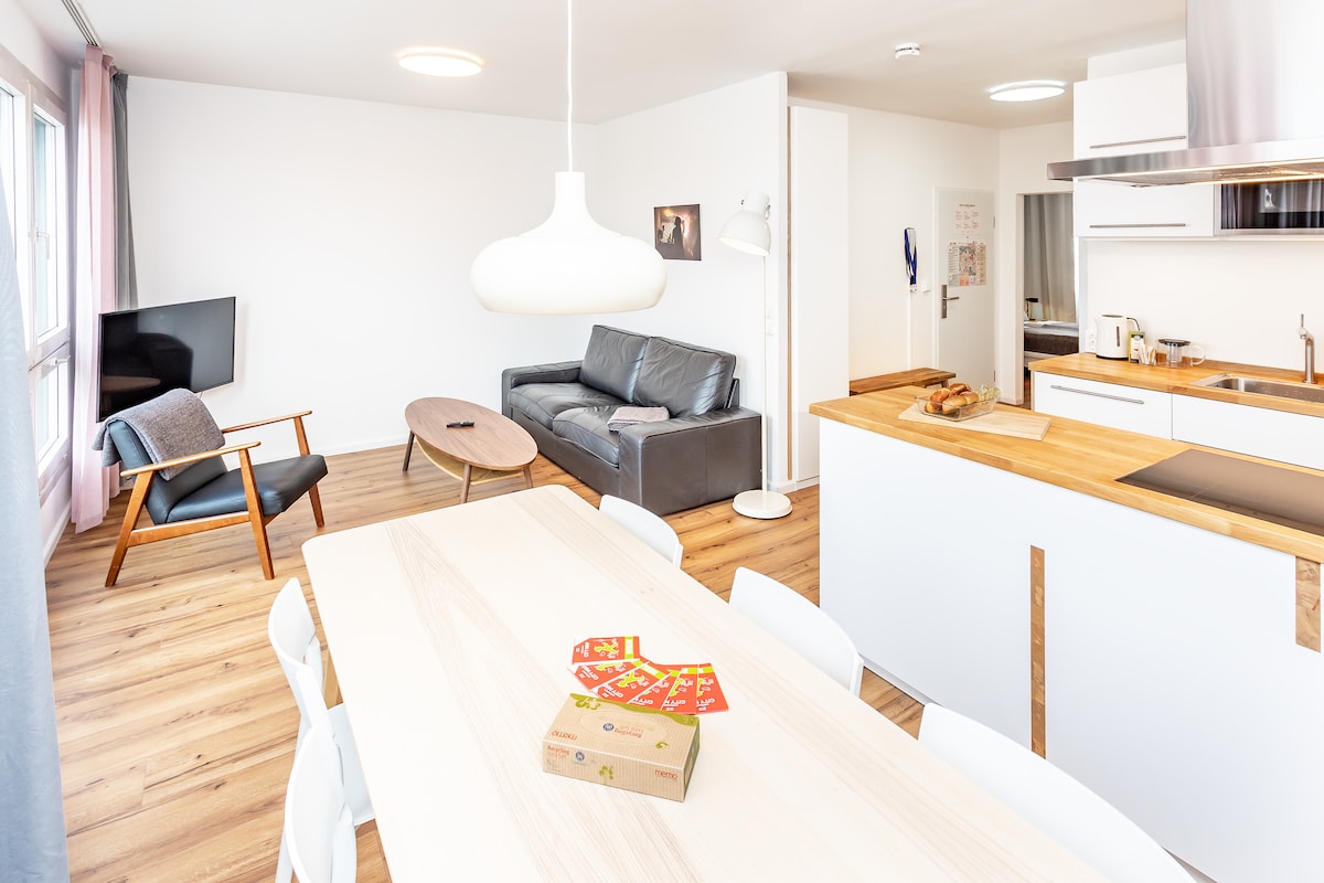 ¿Una escapada a la ciudad o una estadía larga? Con todo lo que necesitas para vivir, estos elegantes estudios de 22 m² están diseñados de manera inteligente, con texturas naturales y acabados únicos. Tendrás una cómoda cama tamaño king de 150 cm x 200 cm en el Reino Unido, un escritorio para trabajar, una cocina pequeña para cocinar sin esfuerzo y un baño moderno. ¿Tienes lavandería? La lavandería comunitaria es tuya para que la uses como quieras. Descargo de responsabilidad: puede que el apartamento de la foto no sea el que te quedas.