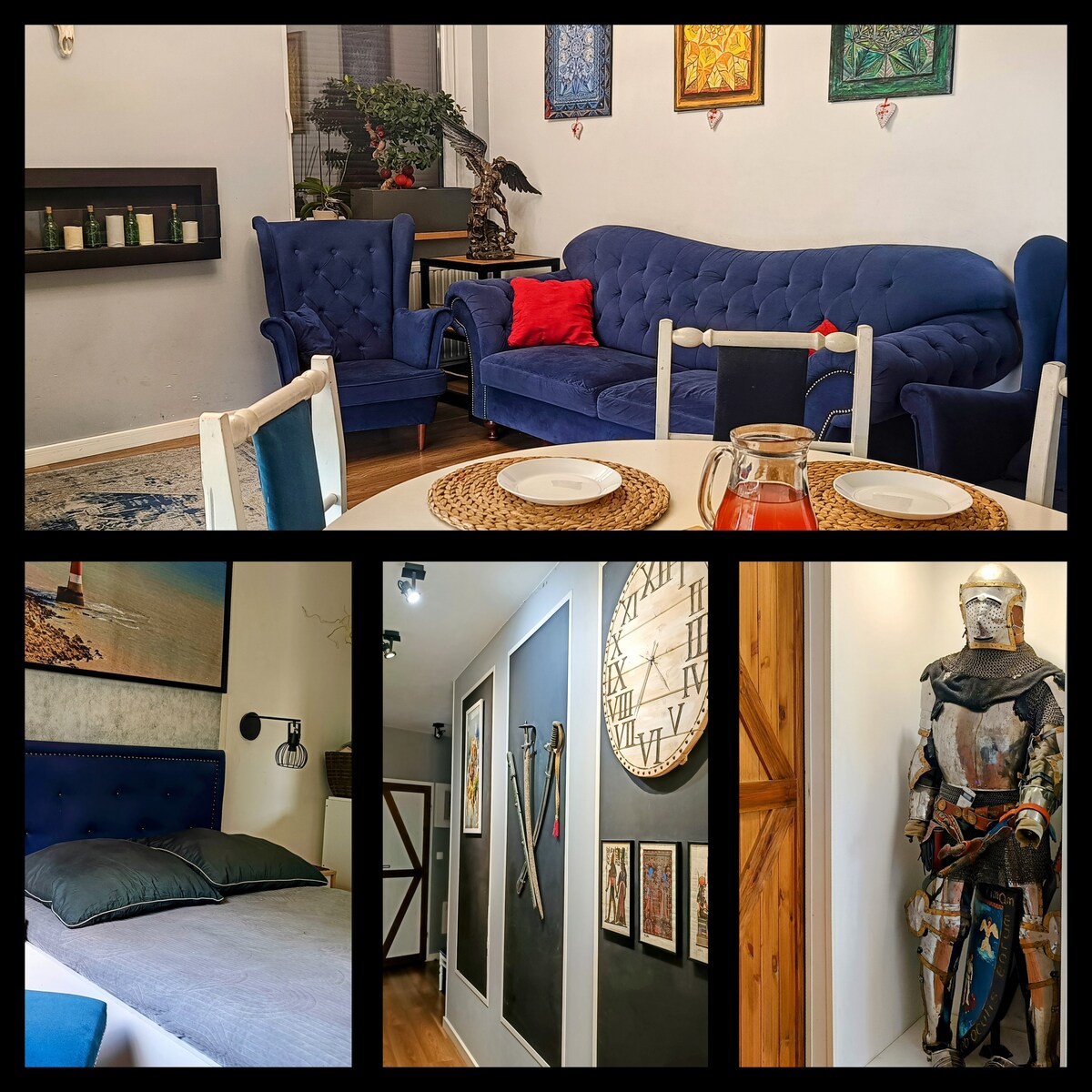 🏰 - COMFORT+ 60 m²: living con cocina americana, 2 dormitorios, - 5 personas + cama adicional para bebé, - PlayStation, lavadora-secadora, electrodomésticos completos - Auténtica ARMADURA DE CABALLERO: tocá la historia, probate un casco - GALERÍA DE ARTE Y ARMAS - sable, katana, bejbut, pinturas originales - BALCÓN ROMÁNTICO: lámparas atmosféricas, hierbas frescas, noches atmosféricas - PARQUE justo debajo de la cuadra: un oasis verde, perfecto para un paseo - Estacionamiento privado en el garaje subterráneo (30 PLN/día) o estacionamiento gratuito en la calle