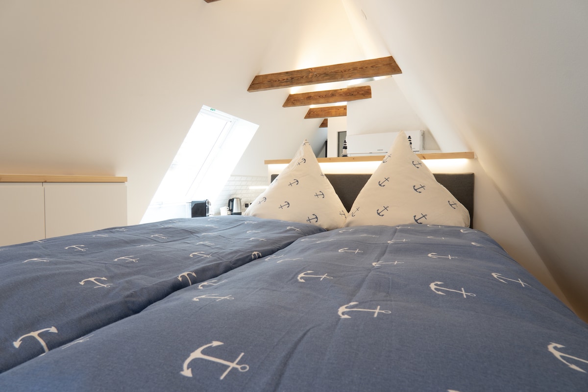 Este apartamento «ático» se encuentra en uno de los rincones más bonitos del centro histórico de la ciudad hanseática de Stralsund (y Patrimonio de la Humanidad de la UNESCO). Se extiende por los dos pisos superiores justo debajo del techo de tejas rojas de una casa construida en algún momento alrededor de 1760 sobre cimientos de 1300. El apartamento bañado por el sol está a dos manzanas del puerto y el Oceaneum al este y, el ayuntamiento/plaza del mercado antiguo al oeste. Diese Maisonette Wohnung ist mitten en der Stralsunder Altstadt.