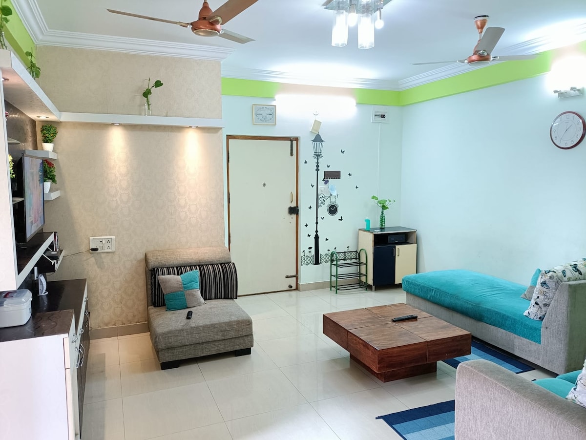 Haga que su viaje a Bangalore sea memorable con una estancia cómoda con nosotros en nuestra morada Doddanekundi ubicada en Nisarga Shelters Fern City Road, ORR, Doddanekundi.2.5BHK con 2 baños, dos grandes balcones, dos camas king size en cada dormitorio, un colchón adicional significa que hay suficiente para grupos de hasta 8 personas, TV LED con conexión por cable, sofá, ropa de cama fresca, cocina completa, Power Back-up para ventiladores y luces, una zona para fumadores en los balcones, todos tenemos cubiertos.