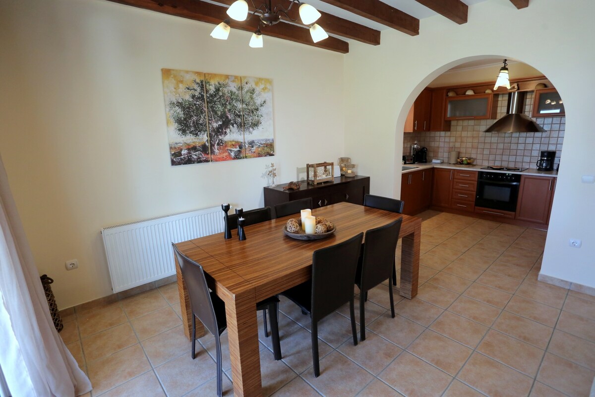 This brand new stone house manages to blend a mix of traditional and neoclassic styles into the perfect vacation "maison".Its open space layout is ideal for families while its size alone makes sure that you will feel spoiled.On a total of 165 m2 there are 2 very spacious bedrooms and two full bathrooms on the top floor and an open plan full kitchen, dining room,living room,office space and bathroom on the ground floor. It is possible to rent it together with a separate cottage for 2 extra people