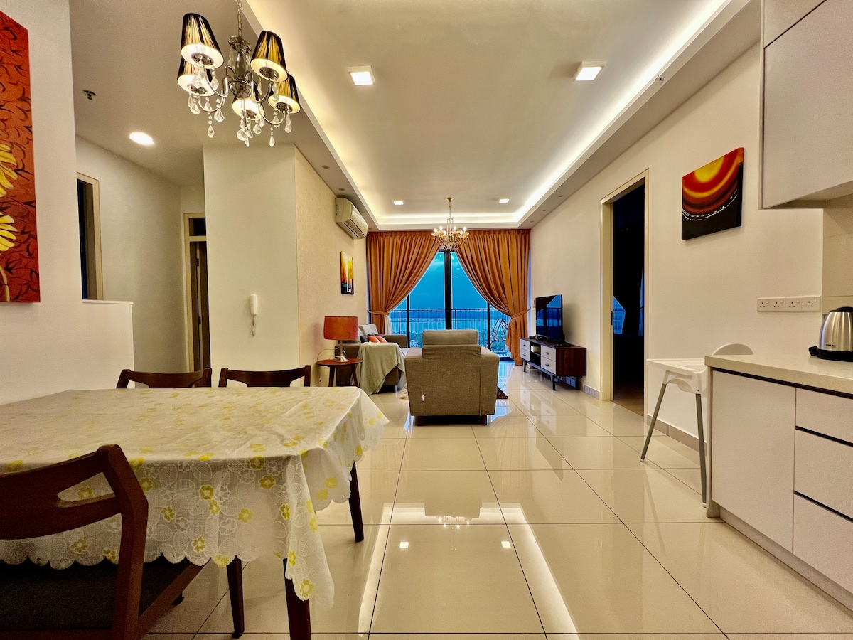 - 520 sqf build up area - 1 queen bed (Foldable mattress will be provided upon request) - Allocate with wardrobe in the room - Rain shower with water heater - 2 unit of air-conditioning - Flat screen smart TV - Sea view balcony Kitchen - Dining table with 4 dining chairs - Refrigerator and microwave - Electric kettle - Cooking hood and hob - Washing machine Car park - You can park anywhere at the basement at visitor parking Please take note that we only provide one access card and one key.
