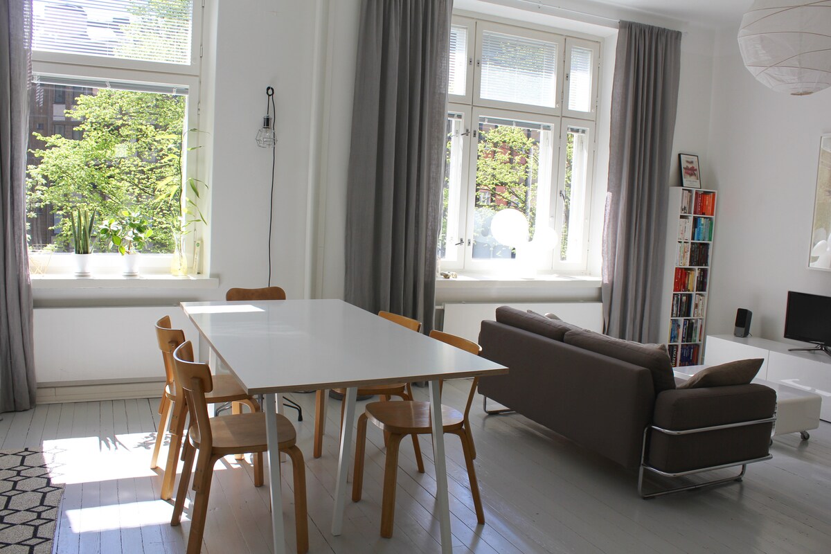The apartment is located in the central area in the city of Helsinki. Kallio is a laid-back bohemian area known for its many Finnish saunas and the Kallio Church. The area is tightly woven with blocks that offer a wide range of cafés, restaurants and various shops, while Hakaniemi Market Hall is packed with Finnish delicacies and crafts. A buzzing foodie scene includes popular bistros, bars and craft coffee spots. The bars and restaurants have a casual, alternative vibe.