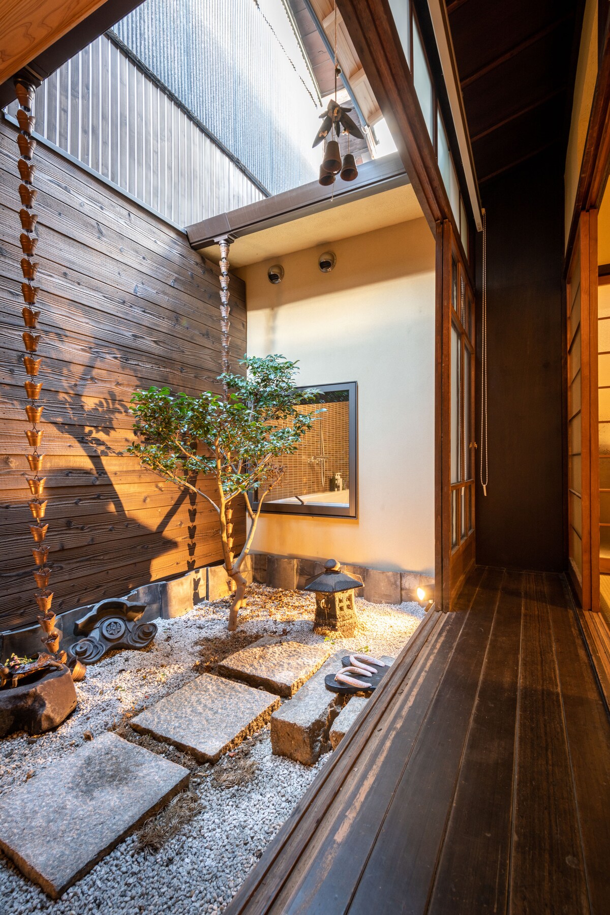 中庭に差し込む柔らかな光が、百年の京町家を照らします。 観光地の喧騒から少し離れ、地元に暮らすように京都に滞在したい方におすすめ。 本町家は一棟貸しのため、ほかのゲストを気にすることなく、ご家族やご友人だけで、ゆったりとした時間をお過ごしいただけます。 宿の一部の壁はDIYで自分たちで手を加え、インテリアも自分たちで厳選しました。アンティークのステンドグラスや野口勇の和紙照明、シモンズのベッド、無印良品のベッドリネンなど、ゲストに自宅にいるような温かさを感じさせるための工夫がされています。昔の京都の風景をそのまま感じられます。 从中庭洒落的柔和光影,静静诉说着百余年京町家的生活风貌。 远离闹市的喧嚣,推荐想像当地人一样生活、体验京都的旅人入住。 本町家为整栋出租,无需与其他客人共用空间, 您可以仅与家人或朋友一起,悠然享受私密而宁静的时光。 房屋内的部分墙面由我们亲手进行DIY改造, 室内陈设与装饰也皆由我们精心挑选与布置。 古董彩色玻璃、野口勇设计的和纸灯具、Simmons 床垫与无印良品床品, 处处细节都希望能让客人感受到如同在自己家中般的温暖与安心,静静感受京都特有的岁月气息。