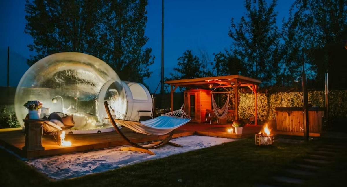 Welcome to your private wellness oasis under the stars! Our BubbleTent for two offers a unique nature escape in the mountains of Yarlovo, just a short drive from Sofia. Relax in the private hot tub and sauna or enjoy the peaceful garden and pond. Perfect for couples seeking romance, nature, and wellness. Optional outdoor equipment and a romantic package are available. Ideal for hiking in Vitosha or day trips to the Rila Lakes.
