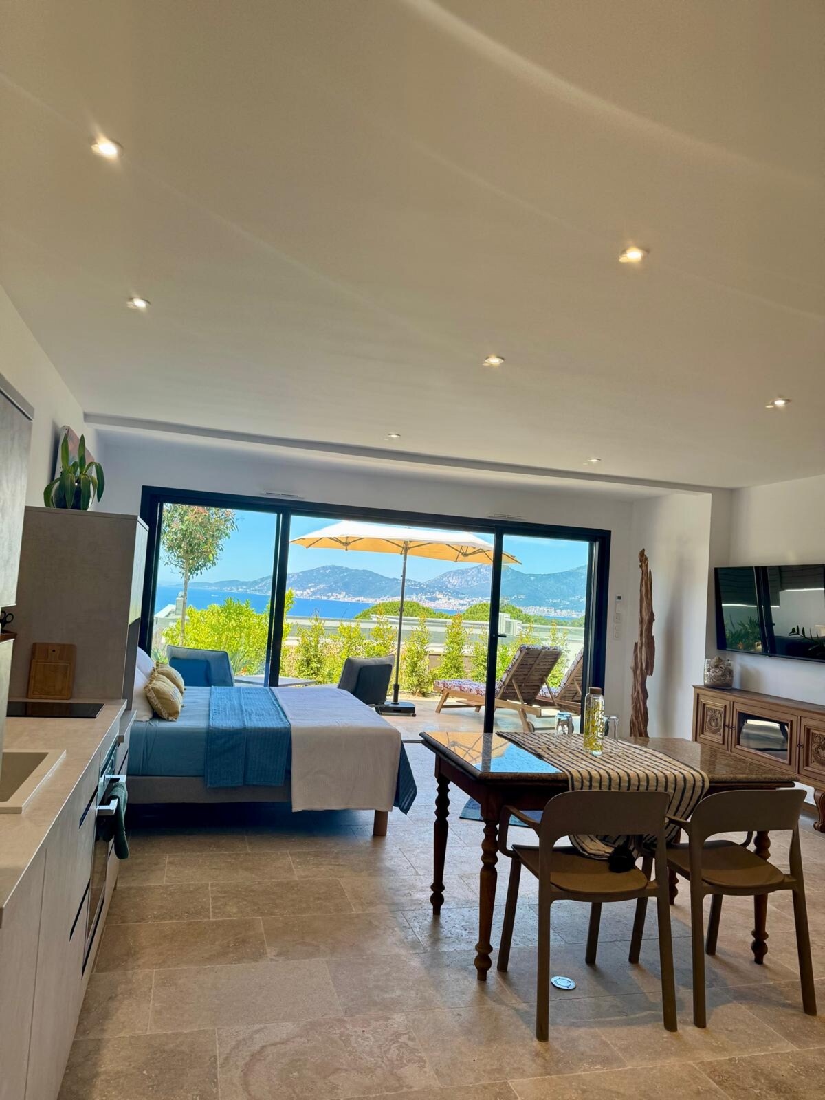 Jolie studio climatisé, vue mer, chambre en mezzanine de 15 m2 mansardée accessible par une échelle, plafond bas (lit en 140). Il y a un clic clac dans la pièce principal et un coin cuisine donnant sur une terrasse de 12m2 avec vue mer. La Résidence calme avec parking gratuit. Deux Piscines gratuites et snack ouvert en saison estival. A 2 min de la plage de Porticcio, 10 min de l aéroport, 15 min d Ajaccio. Linge de maison non fournis ( supplément 25 / 2pers)