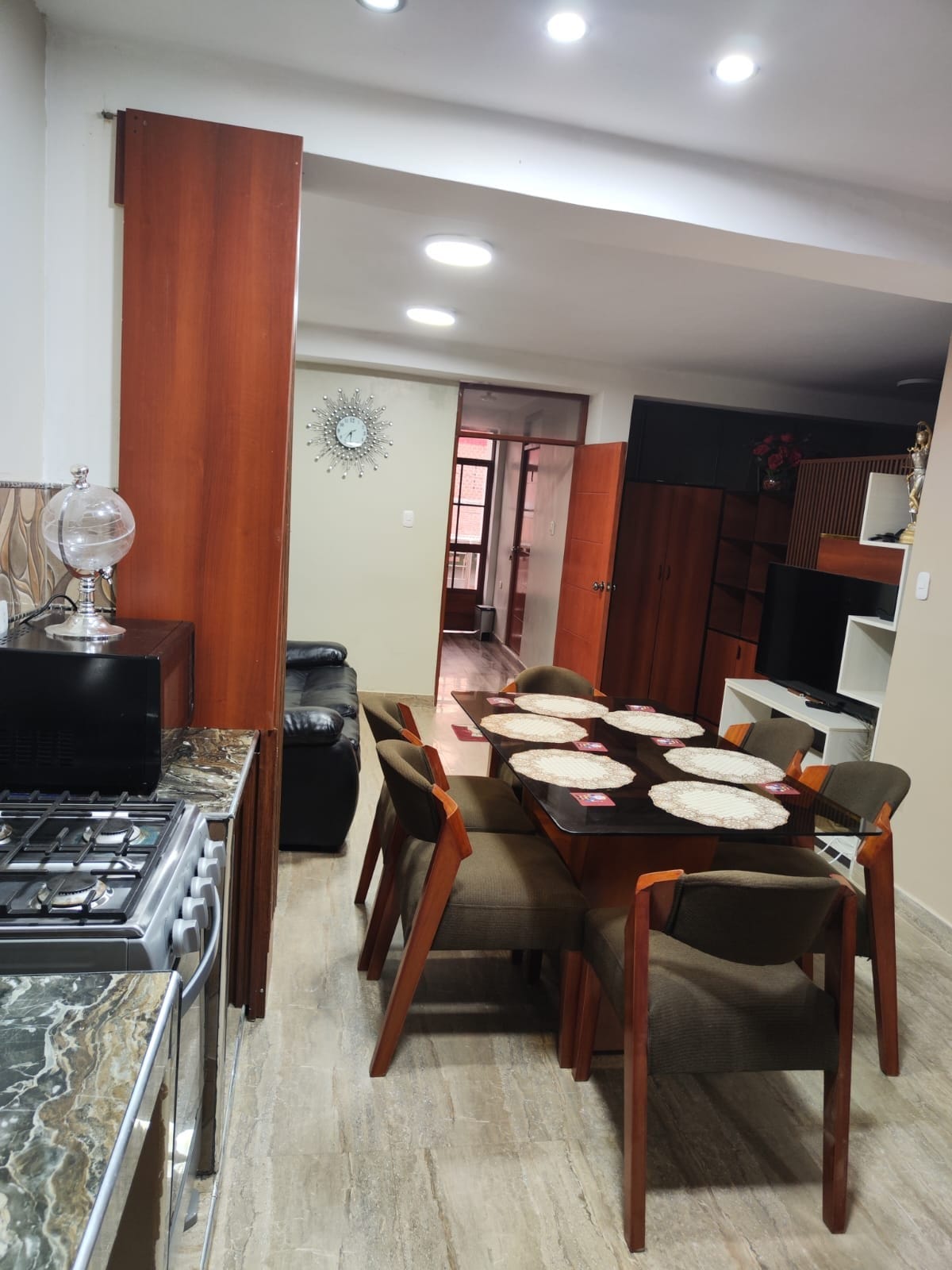 Relájate y disfruta de la sencillez y comodidad de este alojamiento único, tranquilo y céntrico Es un Mini departamento de estreno, ubicado en el centro de Chachapoyas, a una cuadra de la plaza de armas. Cuenta con una sala kitchenet, un dormitorio con cama Queen y en la sala tiene un sofá cama de dos plazas, está equipado con cocina y menaje, tiene lavadorasecadora (sin costo adicional por el uso) internet, TV y agua caliente, ideal para 2 a 4 personas.