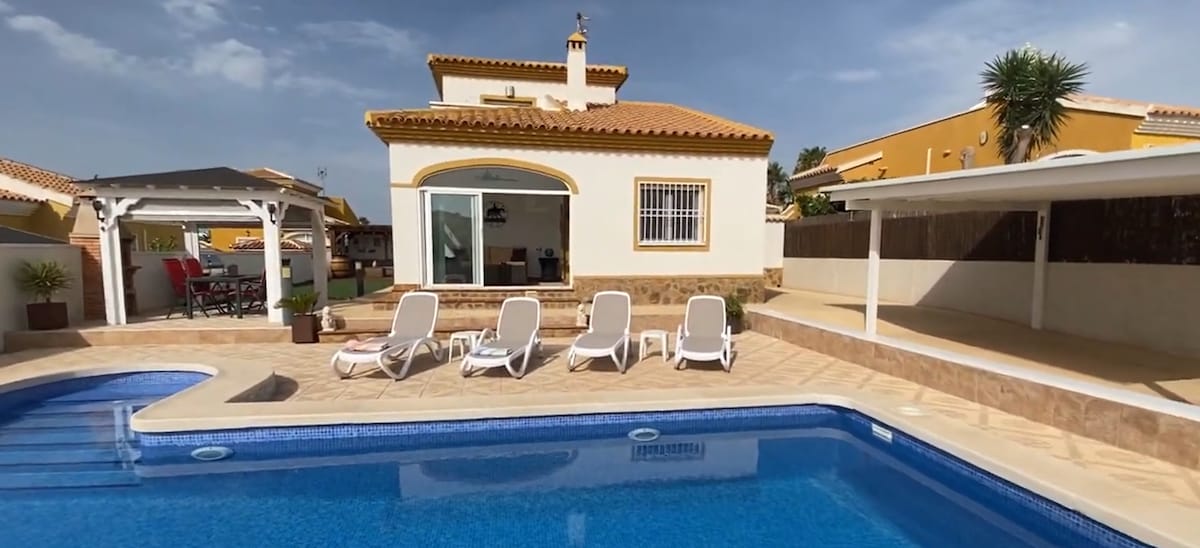 Villa con piscina privada y terraza en la azotea. El alojamiento contiene 3 dormitorios dobles, sala de estar, cocina, lavadero y 2 baños (1 dormitorio y 1 baño están bloqueados para los propietarios no actuales). Fibra óptica de 50 Mbps, TV, altavoz Bluetooth para música o radio. Cocina totalmente equipada, zona de barbacoa exterior y áreas de chill-out a la sombra. A 25 minutos del aeropuerto, a 10 minutos de las playas de "bandera azul". Hay unos 50 bares y restaurantes en la zona. El área más cercana está a 450 metros de la villa.