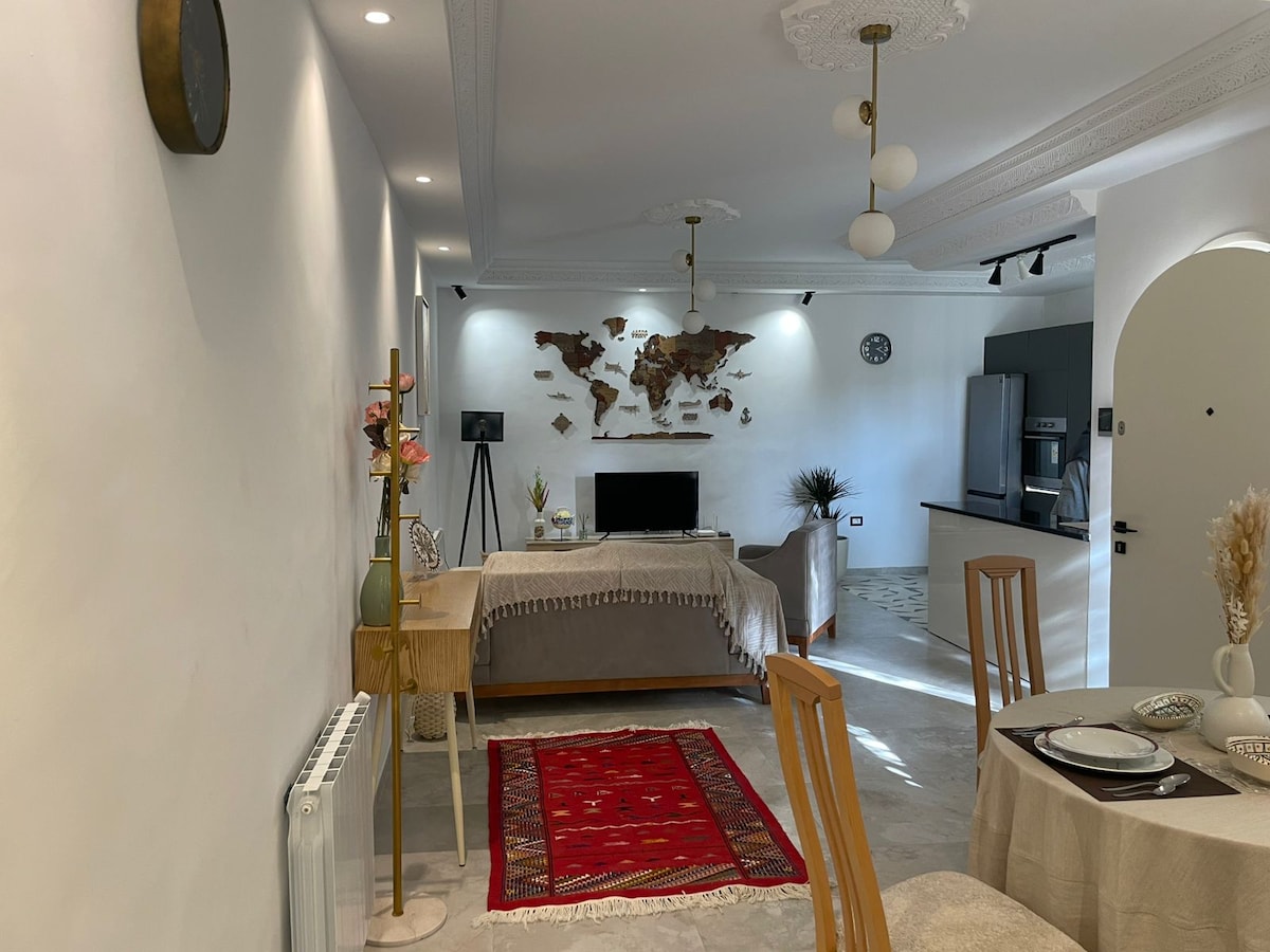 En Sidi Bou Saïd, en un remanso de silencio y luz, este gran luminoso S1 mezcla tradición árabe-andaluza y comodidad moderna. Chimenea, terraza florida, arcos, zelliges y muebles artesanales crean un ambiente único. Cocina equipada, Wi‑Fi de alta velocidad,TV con todos los canales ,películas y series, ropa de cama cuidada. En 15 minutos a pie: callejuelas azules, cafeterías, mar y sabores locales. Ideal para crear, reponer energías, evadirse o simplemente respirar.