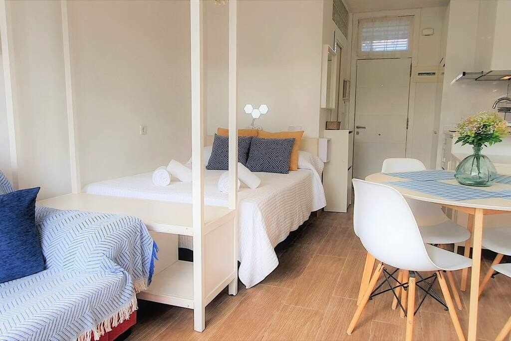 Estudio muy luminoso con impresionantes vistas, a 250 metros de la playa. Con vistas al mar y a la montaña. Balcón espectacular para el verano, se ve el amanecer y por las tardes da la sombra. Ideal para comer y cenar. Cuenta con todas las comodidades, cocina completa (con microondas, tostadora, placa de inducción, etc.), aire acondicionado con bomba de calor, lavadora, nevera, tv, mesa y sillas tanto dentro del estudio como en la terraza.