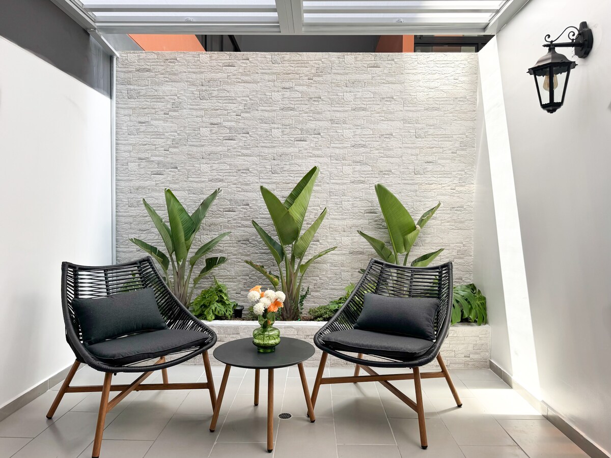 Moderno departamento que combina diseño contemporáneo y comodidad. Cuenta con una sala luminosa conectada a una terraza privada con sillas modernas y plantas, ideal para relajarse. La cocina equipada incluye electrodomésticos modernos y un comedor con mesa de mármol. El dormitorio principal tiene cama queen, un clóset amplio y TV. Además, ofrece Wi-Fi ,acceso a la piscina del edificio y lavaseca , perfecto para estancias largas o cortas. *preguntar por disponibilidad de estacionamiento