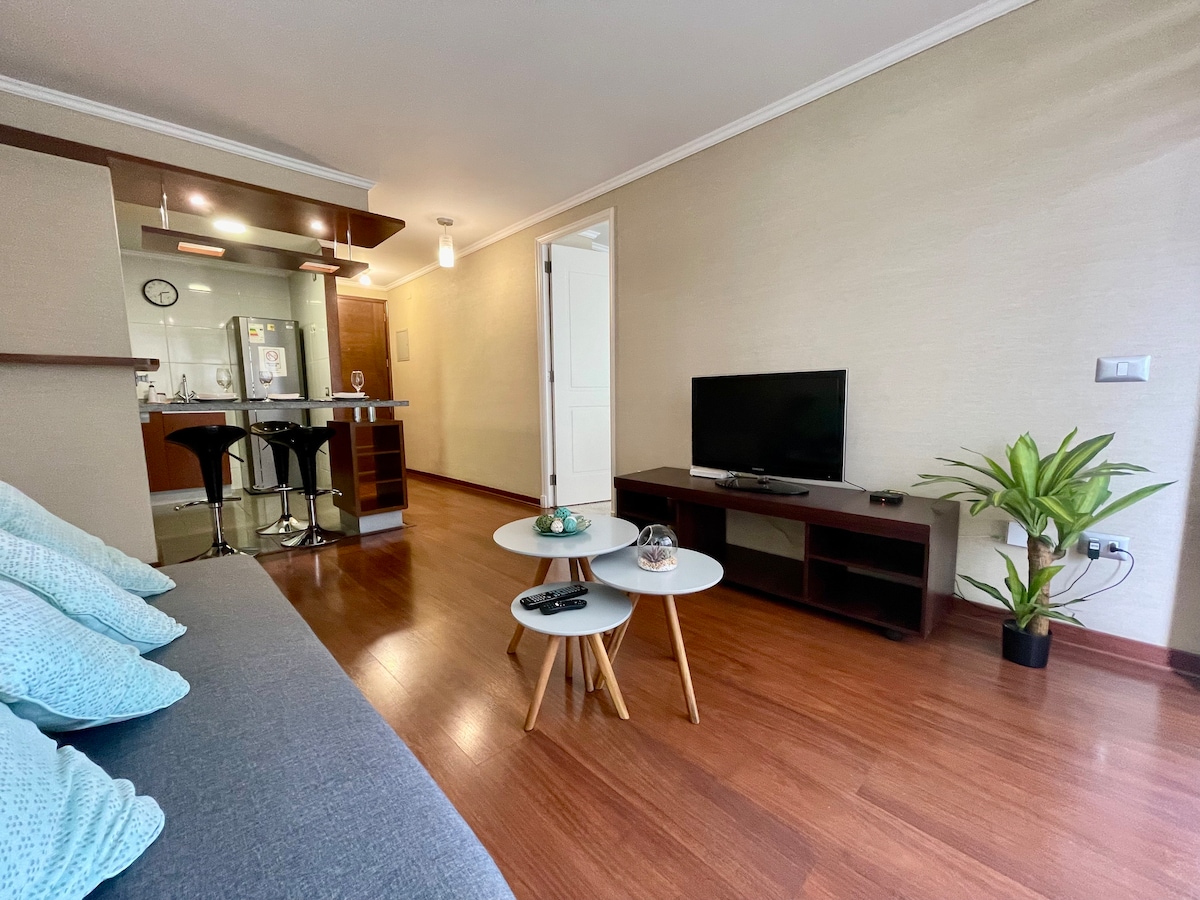 Encantador departamento en el corazón de Santiago con una impresionante vista panorámica del centro de la ciudad. Disfruta de los rascacielos iluminados por la noche y de paisajes urbanos durante el día. Este acogedor espacio cuenta con comodidades modernas, una decoración elegante y todas las comodidades necesarias para una estancia inolvidable. Desde el balcón privado, podrás deleitarte con vistas panorámicas que abarcan desde la cordillera hasta los puntos emblemáticos de la ciudad.