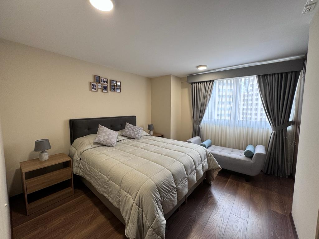 Disfruta de una estancia placentera en este departamento moderno con vista espectacular, ideal para descansar o trabajar con total comodidad. Cuenta con areas de relax (piscina, sauna seco, vapor y gimnasio), cada detalle ha sido pensado para ofrecerte una experiencia acogedora, práctica y agradable. Ubicado en una zona estrategica, tranquila y segura, cerca de cafés, embajadas, bancos, supermercados, restaurantes y transporte público. Perfecto para parejas, viajeros o estancias por trabajo.
