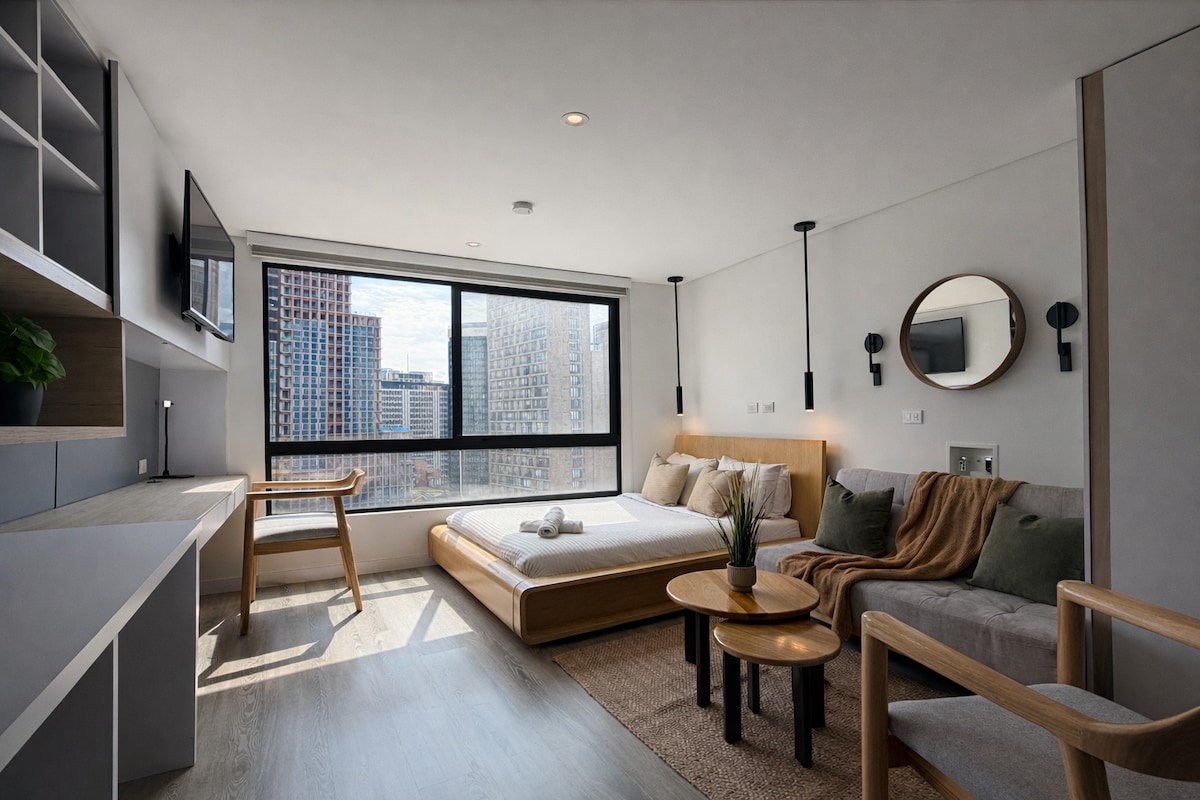 Stunning loft with breathtaking city & mountain views. Indulge in the most luxurious bed in the building, providing a level of comfort akin to a five-star hotel. Plush pillows ensuring the best sleep of your life. Enjoy a 60" TV with Netflix, a well-equipped kitchen, and relax in the easy chair by the window. Hot water shower, Hairdryer, ample closet space, and a perfect work area. Upcoming amenities: rooftop, coworking, gym. Close to Transmilenio station. Book now for an unforgettable stay