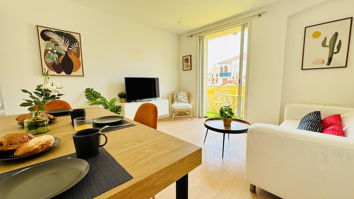 Elegante, refinado y funcional, este apartamento nuevo tiene una superficie de 45 m2, para un máximo de 4 personas. El apartamento está situado en el primer y último piso de una casa. Dispone de un aparcamiento subterráneo gratuito de 300 plazas a 50 m. El apartamento consta de 2 habitaciones bellamente decoradas con camas tamaño queen de 160 cm. Tiene una terraza de 6 m2 con vistas a la plaza Jean Jaures a 50 m. Cocina equipada (lavadora secadora,lavavajillas, inducción, horno, microondas, campana extractora TV Netflix