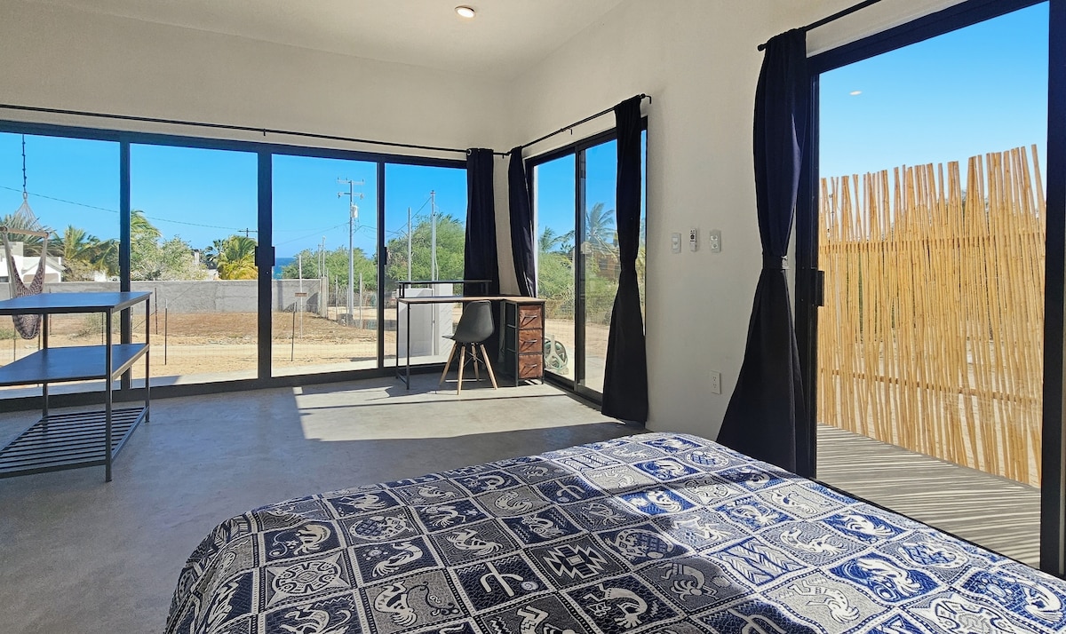 Disfruta de la sencillez de este alojamiento tranquilo y céntrico, ideal para una pareja que viene a disfrutar de las playas y del desierto de La Ventana, a 3 minutos a pie de la playa (PLAYA CENTRAL) a 3 cuadras de la carretera principal. Disfrutarás de un bello amanecer. cuenta con una recamara, TV con Netflix, YouTube, un pequeño closet, un baño, una pequeña cocina con sus instrumentos básicos, un par de sillas cómodas para descansar leer y trabajar, wifi, agua caliente, aire acondicionado