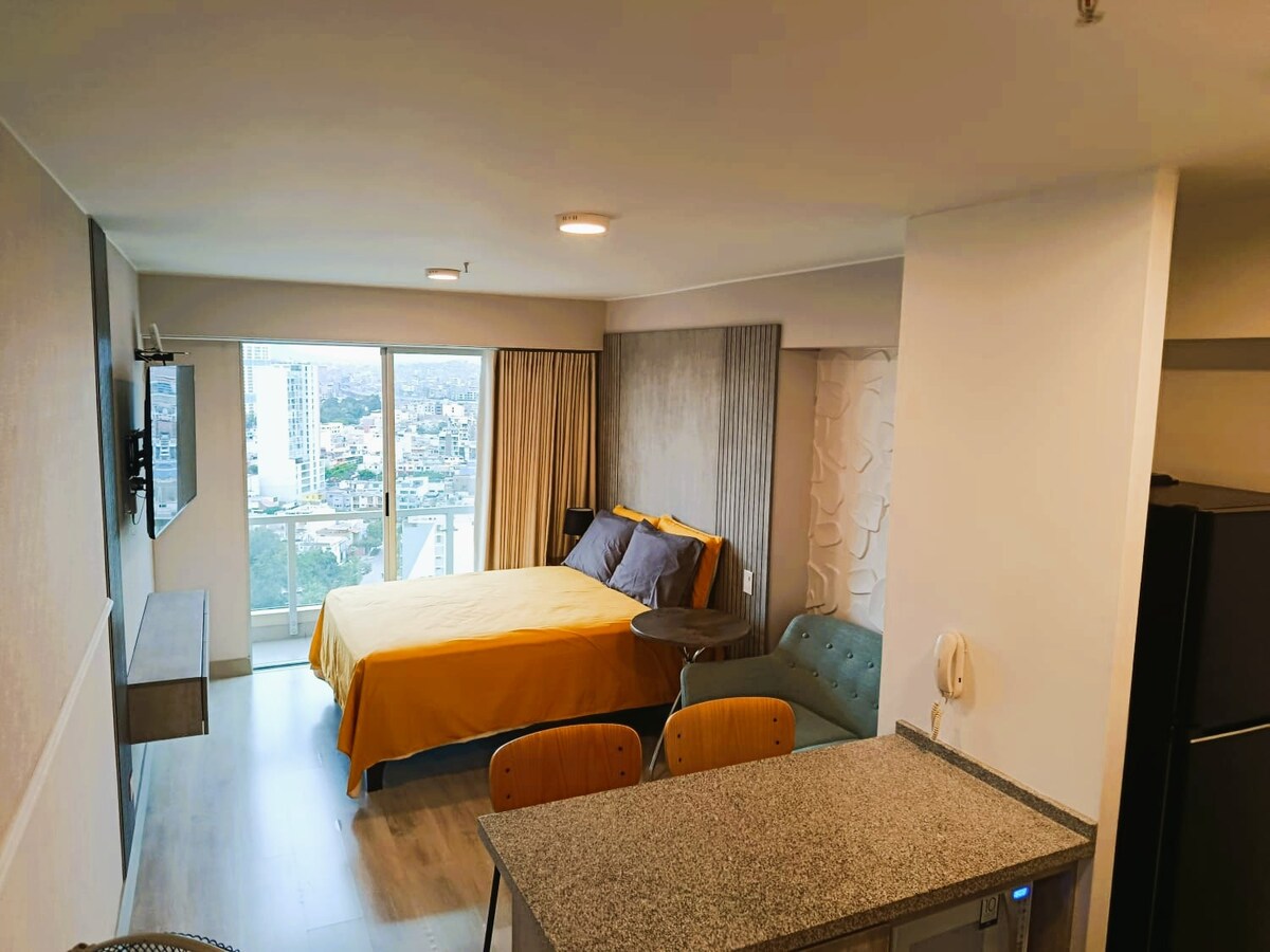 SUPER DESCUENTO HOY DOMINGO 19✨ Check-in y check-out flexible - Consulte Loft de lujo en el PISO 22, súper equipado y moderno, ubicado en la Av. Javier Prado Este, San Borja, a un paso del C.C. La Rambla y el centro financiero de San Isidro. Con vistas panorámicas en un edificio exclusivo con vigilancia y cámaras las 24 h, ideal para vacaciones, negocios y trabajo. Cuenta con: - SmartTV 55'' QNED Lg - WIFI / NETFLIX🍿🎬 - Cama ✨Queen✨ - Cocina equipada Cochera-25 soles Consulte dispo🚗