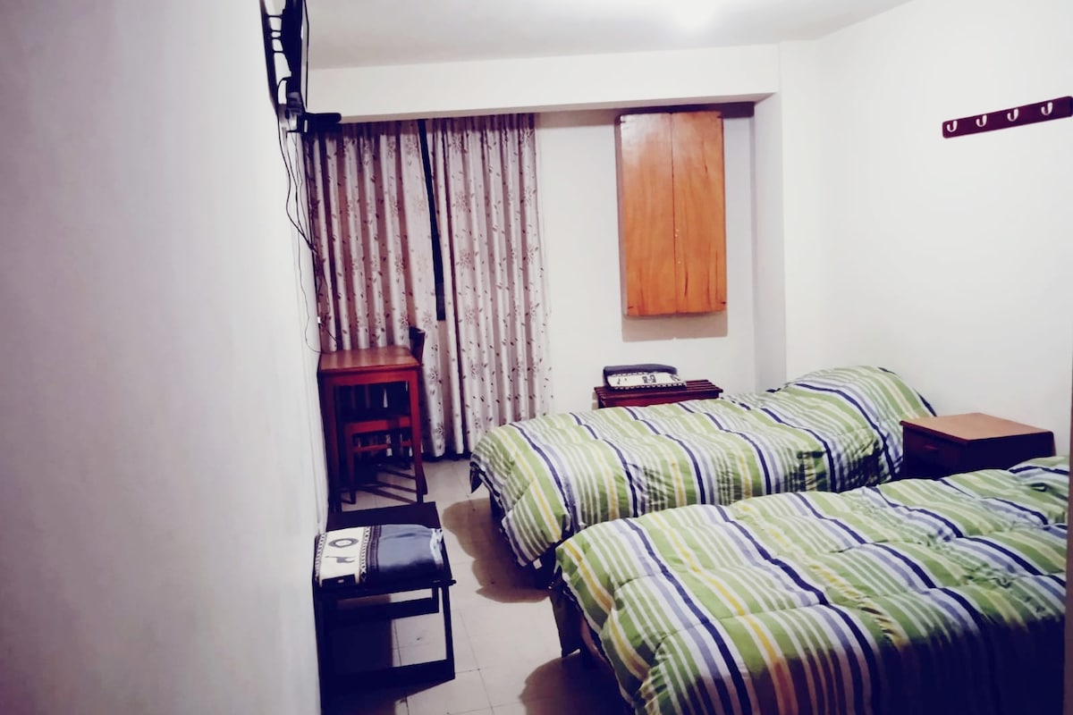 Habitación triple en el tercer piso de Monterrico Hotel Perú. Se encuentra ubicado en la Urb. San Ignacio de Monterrico un lugar privado, seguro y elegante. Aproximadamente a 15 minutos de Miraflores y a 50 minutos del Aeropuerto Jorge Chávez. Contamos con servicios adicionales como , desayunos, almuerzos, cenas , bebidas (aguas, cervezas, vinos, etc.). Habitación ideal para amistades o familia cuenta con 3 camas de dos plazas, aire acondicionado, Frio bar, armario, Wifi, etc.