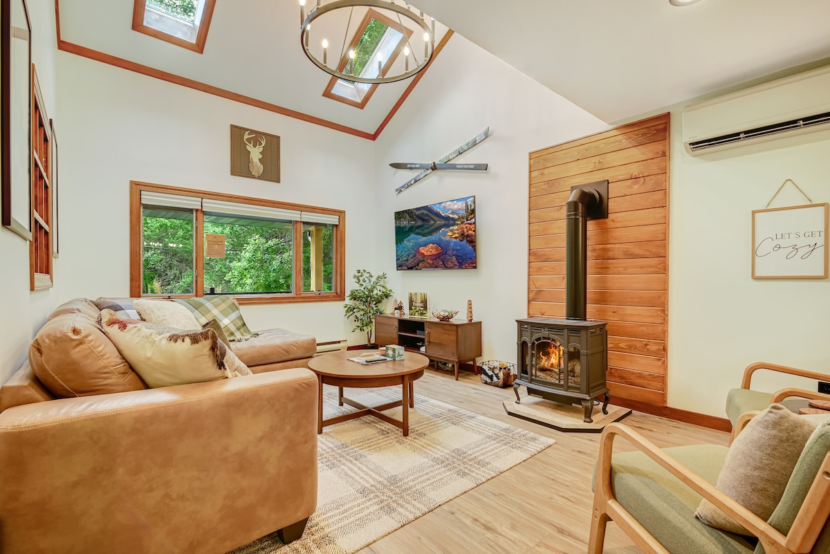 Techos abovedados, chimenea en la sala de estar, 2 dormitorios en el primer piso en esta espaciosa y privada cabaña de 4 estaciones con fácil acceso a los servicios de la zona. La casa está a poca distancia a pie de la piscina cubierta (abierta desde el Día del Trabajo hasta el Día de los Caídos) y a solo una calle de un hermoso parque estatal con más de 2000 acres para explorar con senderos y un lago de arena de 250 acres. La piscina al aire libre, las playas, las canchas de tenis y mucho más están abiertos desde el Día de los Caídos hasta el Día del Trabajo. Hay 3 pistas de esquí a menos de 30 minutos.