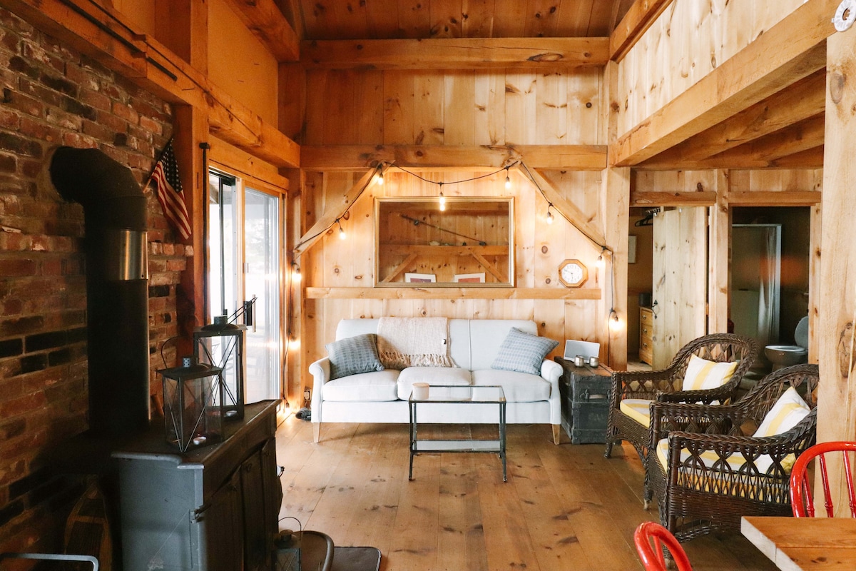 Casa de madera con chimenea exterior personalizada que admite mascotas en Meredith, NH