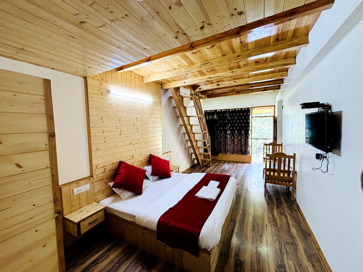 Relájate en nuestra espaciosa habitación Deluxe con balcón privado, que ofrece impresionantes vistas a las montañas y aire fresco del Himalaya. Despiértate con la serena belleza de Pulga (cerca de Kasol), bebe chai mientras disfrutas del paisaje y disfruta de las comodidades de un televisor, interiores acogedores y comodidades modernas. Ya sea que estés aquí por la aventura o la relajación, esta habitación ofrece el refugio perfecto para reducir la velocidad, recargar energías y abrazar la magia de las montañas.