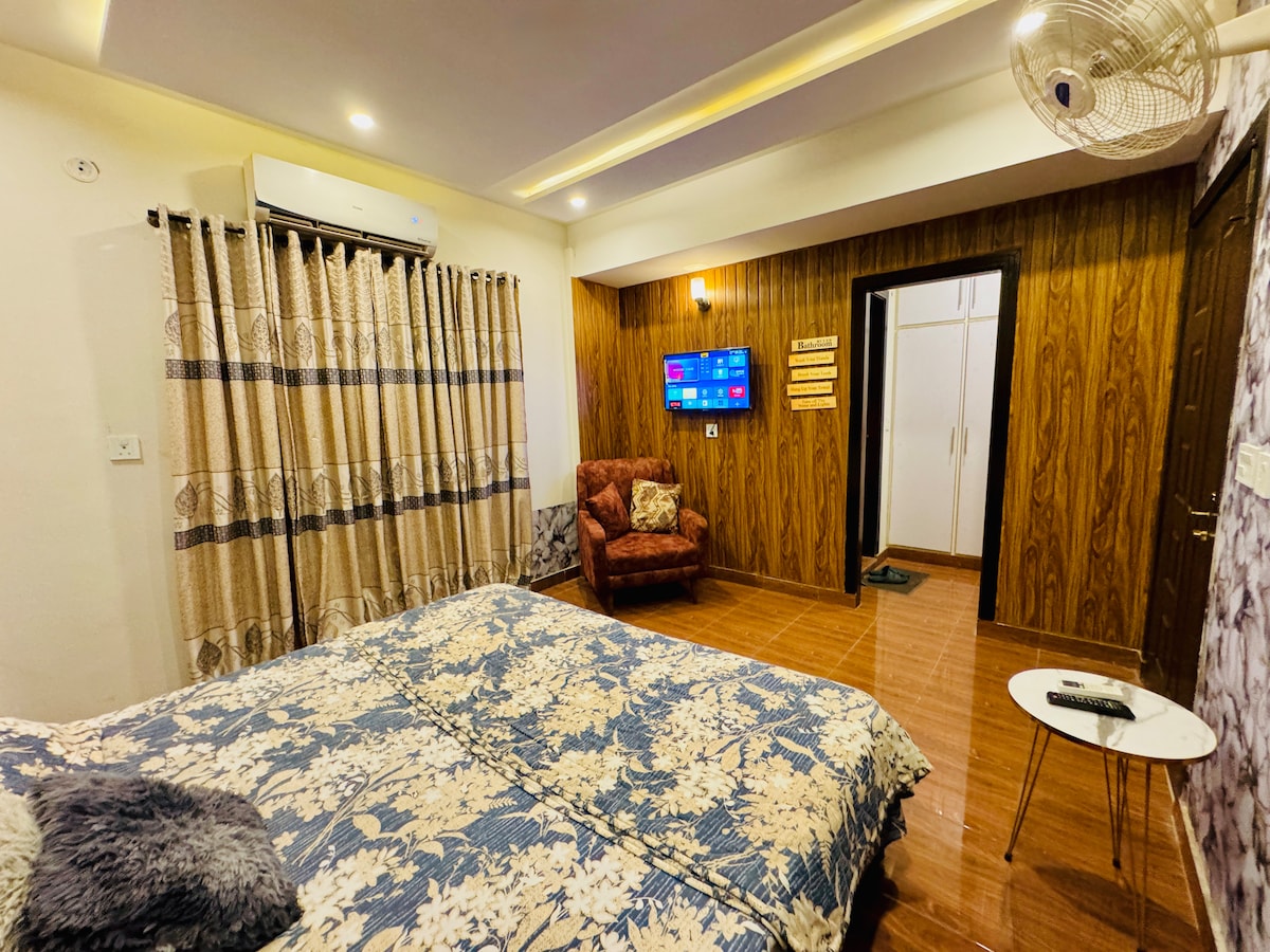 Te damos la bienvenida a Twilight, un departamento único con temática lunar en la Fase 6 de DHA 🌙 • 1 dormitorio con iluminación acogedora y diseño moderno • Salón elegante con decoración artística y Smart LED de 50”. • Cocina totalmente equipada con cocina, microondas y pava. • Wifi de alta velocidad y check-in sin anfitrión sin complicaciones 📍 Ubicación privilegiada cerca de Raya Commercial, Dolmen Mall, Ring Road y muchos cafés La combinación perfecta de comodidad y estilo. Es la mejor opción, ya sea que viajes por negocios o por placer.