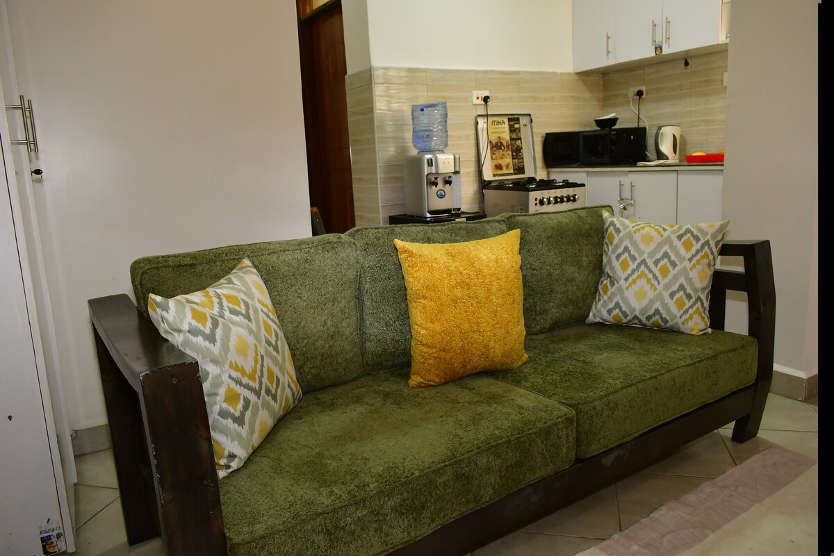 Nuestro cómodo apartamento de 1 dormitorio tiene todo lo que necesitas para tu viaje a Nanyuki. La unidad cuenta con una elegante cocina de planta abierta, un dormitorio generoso con un colchón de calidad de Dr. Mattress, internet de alta velocidad, televisión inteligente, amplio estacionamiento y una hermosa vista del monte Kenia en la azotea. Desde Cider Mall Nanyuki se tarda unos minutos en coche pasando por Fox Hill Apartments y luego Livia Lane a tu derecha hasta California Plaza. Una base ideal para explorar Nanyuki.