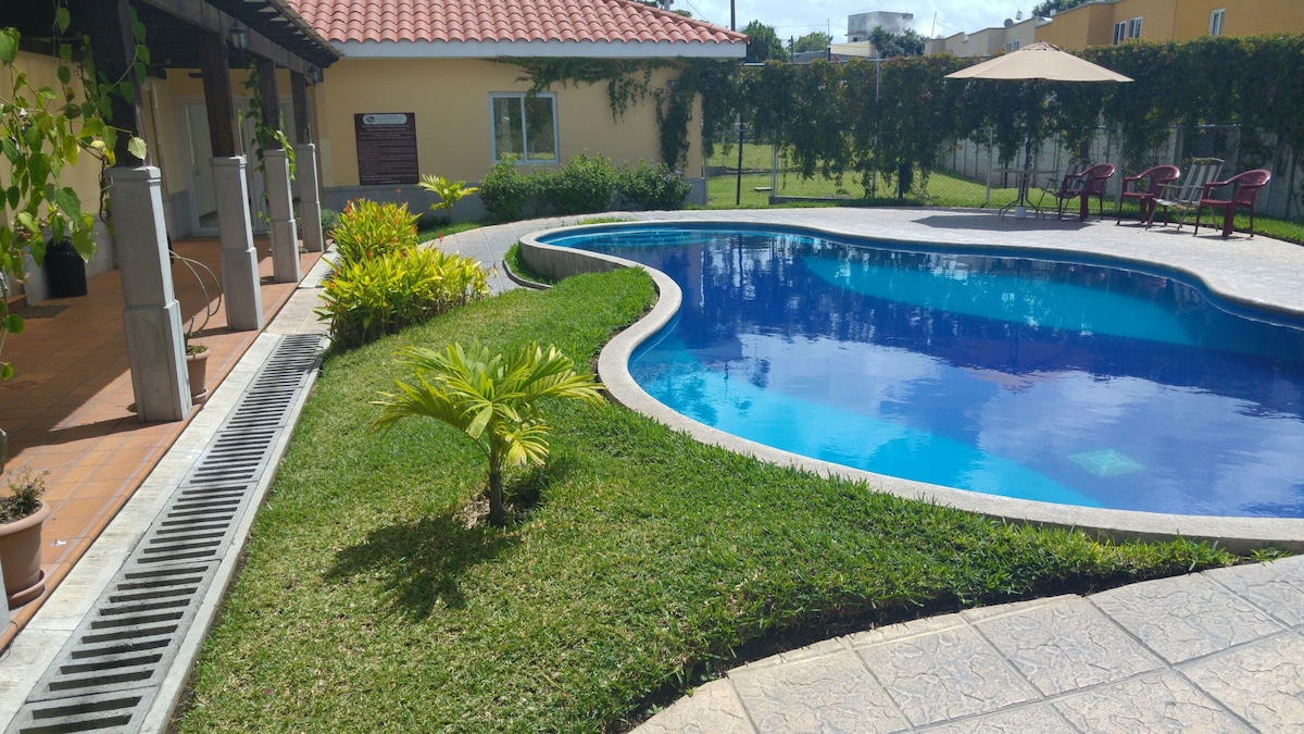 Azvlik House está ubicada a 9 minutos del Casco de Antigua Guatemala. En un condominio agradable para caminar, con plantaciones de café y mucha naturaleza. Seguridad las 24 horas. La casa mezcla la esencia colonial con toques contemporáneos. Un espacio acogedor, rodeado de naturaleza, vistas a las montañas y al Volcán de Agua. En el área del jardín; piscina privada, climatizada con paneles solares, también una parrilla para disfrutar en familia y amigos.