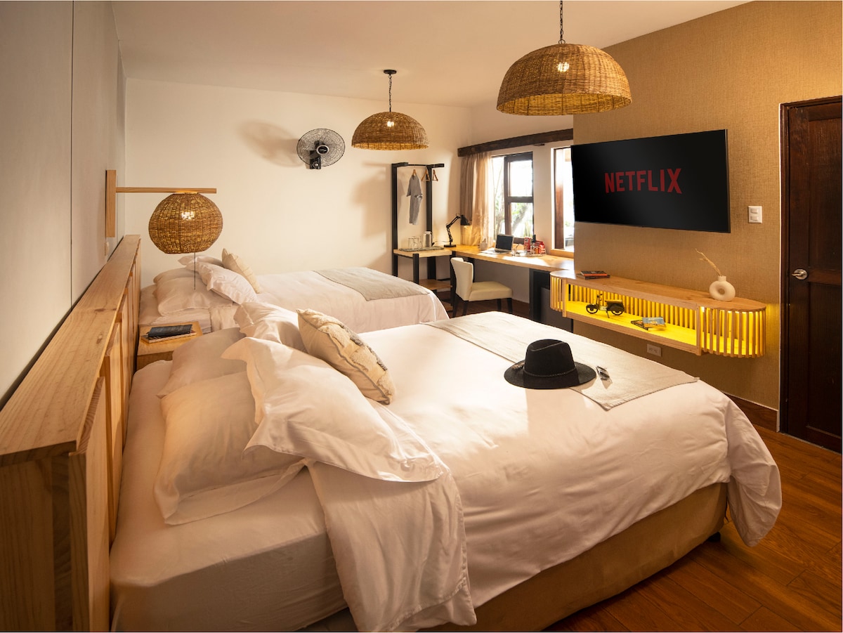 Imagina estar rodeado de luz natural, en un estudio elegante diseñado para reconectar contigo mismo. Ubicado en el corazón de Muxbal, este espacio ofrece tranquilidad sin desconectarte de la ciudad. Perfecto para viajeros que buscan más que solo un lugar para dormir: aquí encuentras estilo, paz y funcionalidad. Contamos con muros panorámicos con vista hacia la Ciudad de Guatemala, bosques de Muxbal y los icónicos volcanes Agua, Fuego, Acatenango y Pacaya.