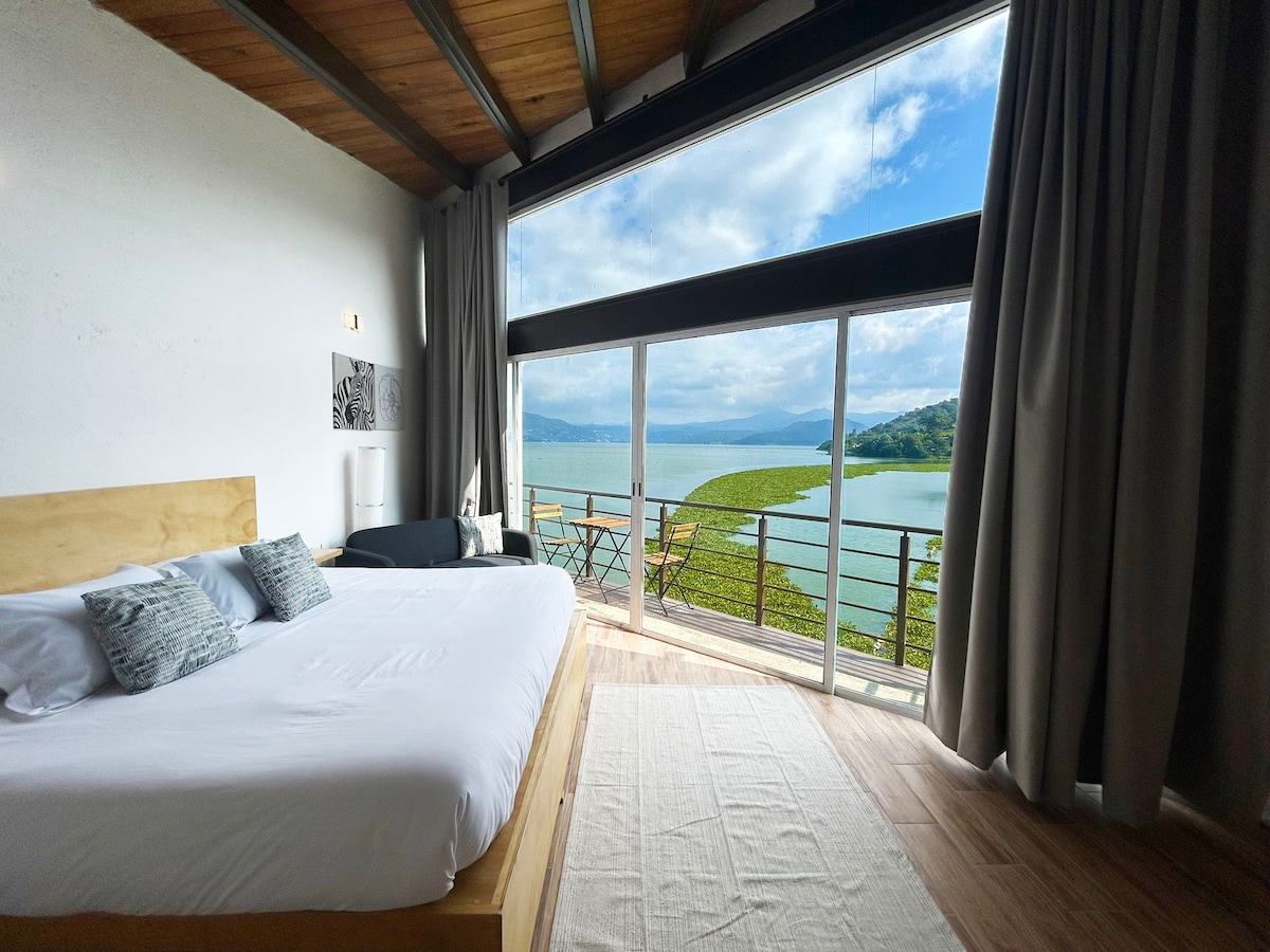 Disfruta vistas espectaculares desde tu terraza privada con comedor ¡que parece flotar sobre el lago! Este exclusivo departamento incluye: Habitación: Suite con cama King, sofa cama y amplio vestidor. Espacio Versátil: Sala con cómodo sofá cama, comedor y cocina. Terraza Panorámica: Tu comedor al aire libre con el lago a tus pies. Acceso a una encantadora alberca con hidromasaje que se comparte con otros dos departamentos. Vive la magia del lago desde tu refugio de ensueño.
