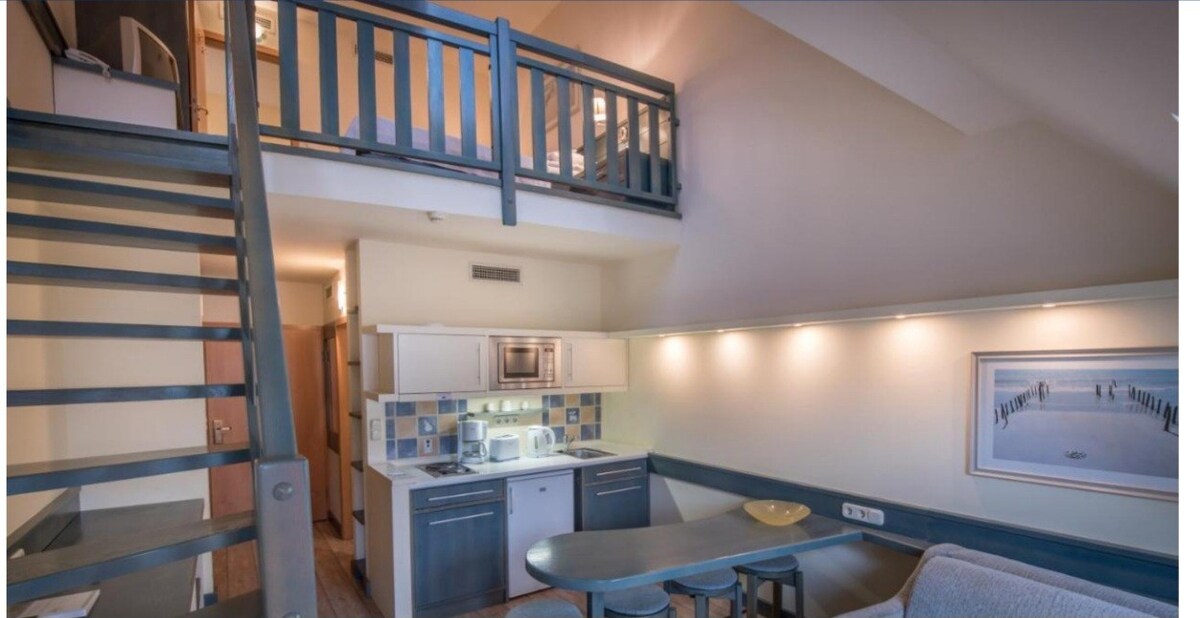 For larger families, groups up to 5 people. The wooden cladding, the atrium interior, the spiral staircase gallery give the air-conditioned chalets a special atmosphere. In their small front garden a garden bench set serves the comfort of our guests. Bicycles can also be comfortably stored here. ATRIUM BUNGALOW : Living room - kitchen - dining room in one space, 1 bedroom with double bed in the living room, 1 small room with two single beds on the ground floor, bathroom. Floor area: ~ 61 m2