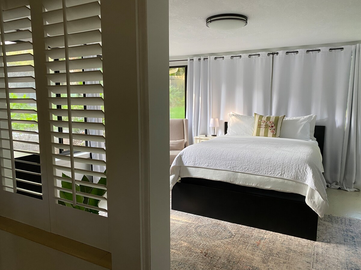 ¡A poca distancia a pie de todo lo que el centro de Mount Dora tiene para ofrecer! Nuestra encantadora casa de campo de 2 dormitorios y 1 baño de 1940 ha sido renovada recientemente. Cuenta con cocina totalmente equipada, terraza con parrilla de gas y chimenea al aire libre. Cómoda y elegante sala de estar con TV inteligente de 65 pulgadas. El dormitorio principal cuenta con cama tamaño king y TV inteligente. El segundo dormitorio tiene dos acogedoras camas individuales. Bicicletas disponibles para su uso. Tanto si vienes a relajarte, navegar, ir de compras o participar en una de las muchas festividades de Mount Dora, ¡considera alojarte aquí!