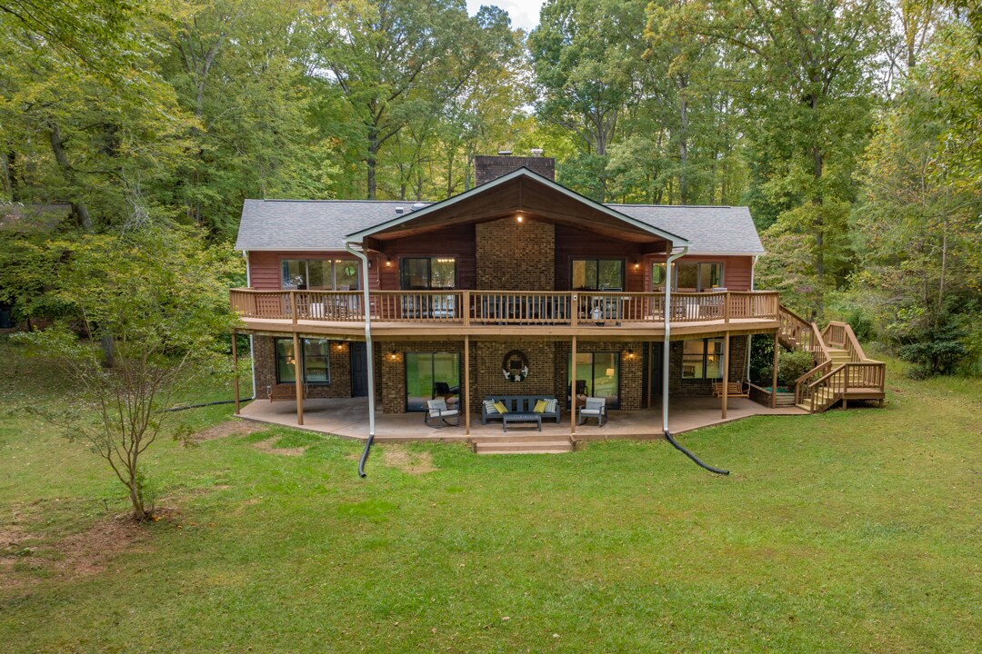 This unique custom-built 4,009 sq. ft. lake house is located at the mouth of Lyons Creek and Lake Gaston with direct main lake access in the upscale subdivision of West Winds. The home offers fabulous views, a large flat yard, a fire pit, a sandy beach area, and good water depth at the boathouse. The home is situated on a large point with over 550 feet of waterfront. The outside boasts a large wrap around porch, with a grill, a 12-person outdoor dining area, and comfortable patio furniture.