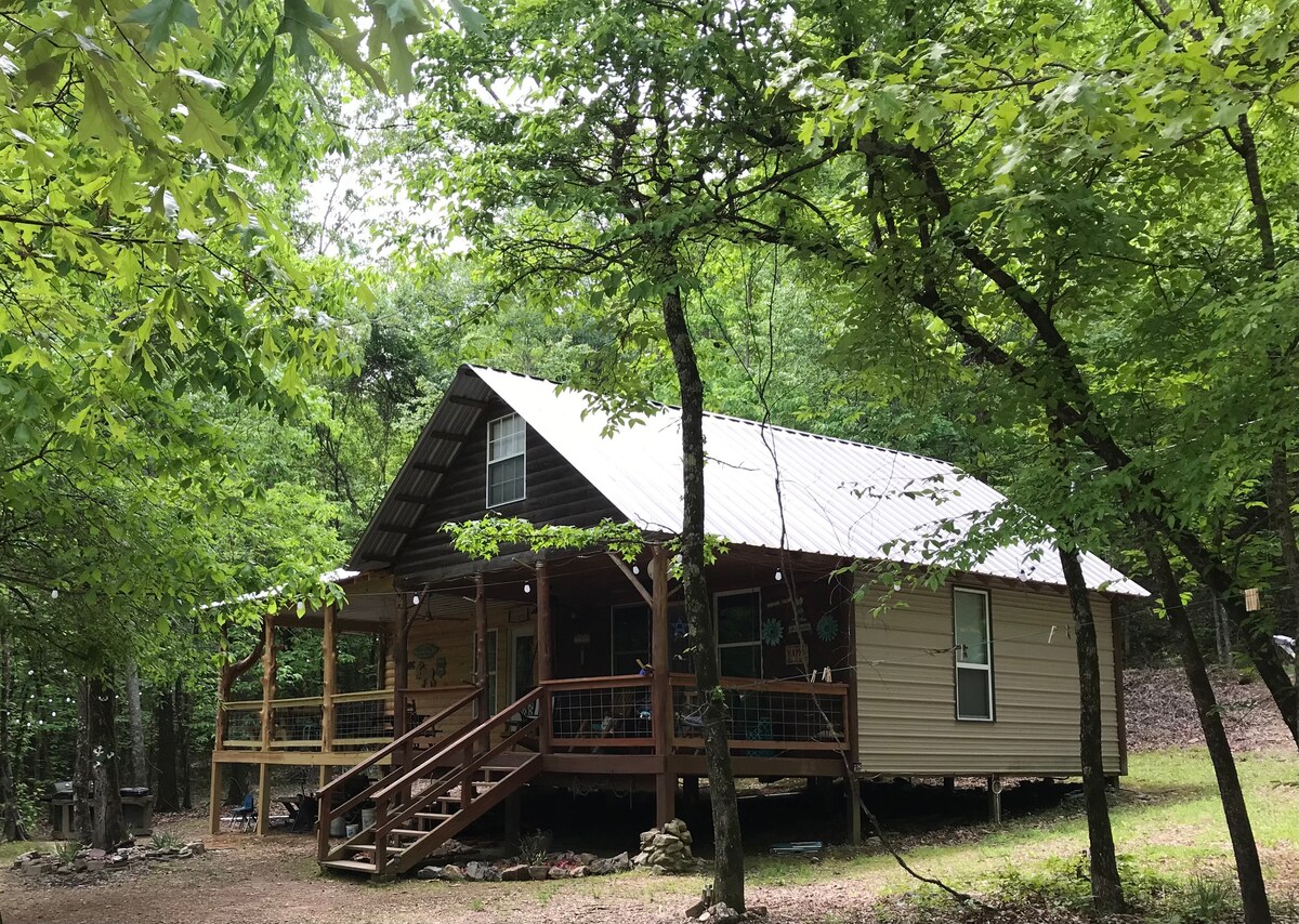 Construido en 2018, dentro del baño remodelado en 2023. Cabaña estudio. Cama king, literas para adultos, sofá de cuero grande, terraza cubierta grande, hamaca, parrilla, inmersión. Hermoso lugar relajante, sumérgete, flota o explora rodeado de árboles/ciervos. Rutas de senderismo Tenemos cabañas Collier y Caddo. ¡El arroyo más bonito! Gorgoteante/fresco cristalino ¡Sin tarifa por perro! Suelos de madera dura, larga distancia gratuita, patio con vistas al arroyo. Wifi y televisión directa. ¡Árboles, ciervos y bonificación totalmente conectada a la casa! ¡No salgas de nuestra propiedad y arroyo!