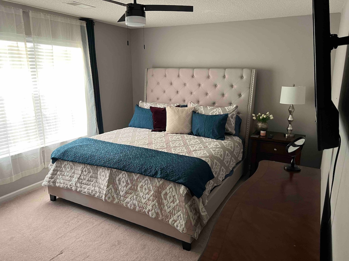 Te espera un oasis privado para darte belleza , comodidad y lujo en Columbia/Lake Carolina Acurrúcate en el sofá cama Downs o disfruta de tu porche delantero cubierto. Disfruta de una larga ducha caliente en tu spa/baño de mármol blanco con 6 cabezales de ducha diferentes. Se proporciona champú, acondicionador, bañera y secador de pelo de calidad. Entra en tu colchón queen de 14pulgadas con 1000 sábanas egipcias que cuestan más que la universidad de mi hijo. Cocina equipada con café y aperitivos Esta es una increíble casa de campo de un piso.