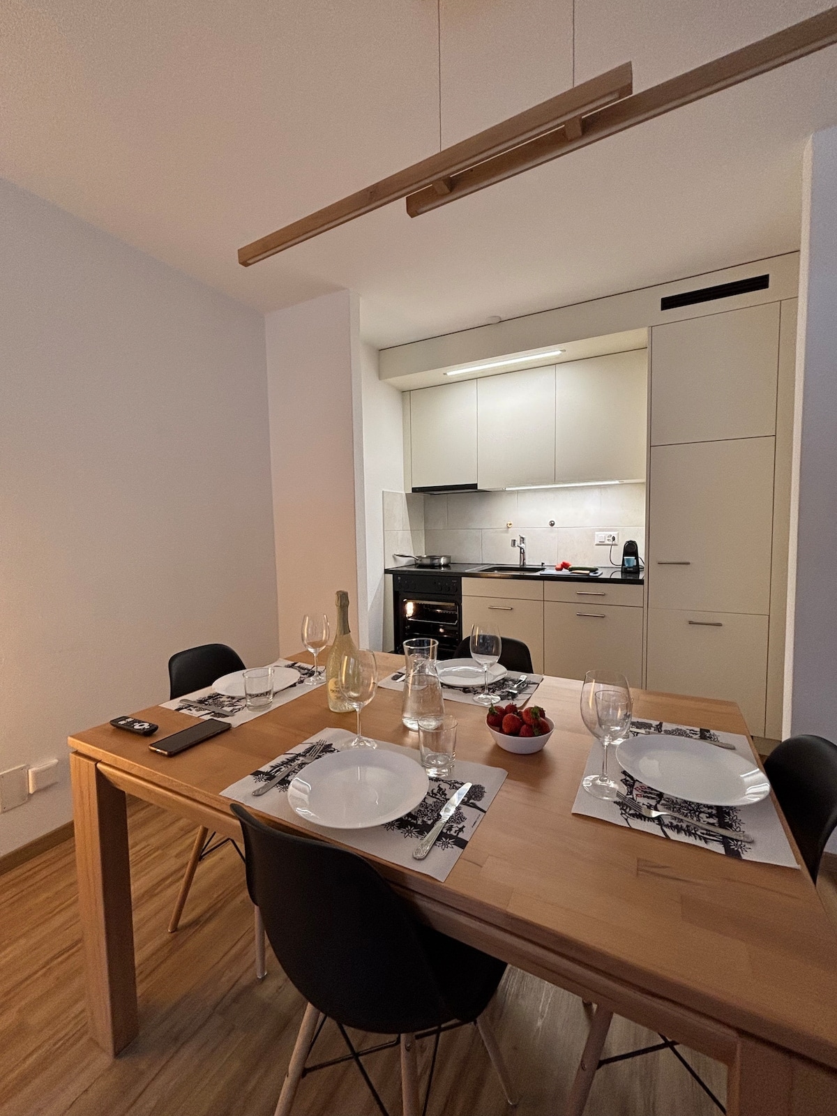 Apartamento renovado con cama de somier, balcón soleado y cocina totalmente equipada en una ubicación céntrica y tranquila junto al lago. Estacionamiento gratuito. En 5-15 minutos: centro, panadería, supermercados, restaurantes, pista de esquí de fondo y autobús de esquí. El juego de fondue y raclette, la iluminación regulable, el televisor nuevo y el altavoz con Bluetooth garantizan noches acogedoras. Internet de alta velocidad hace posible la transmisión y la oficina en casa. Disfruta de tu desayuno en el balcón, del sol en la terraza de la azotea o nada en la piscina.